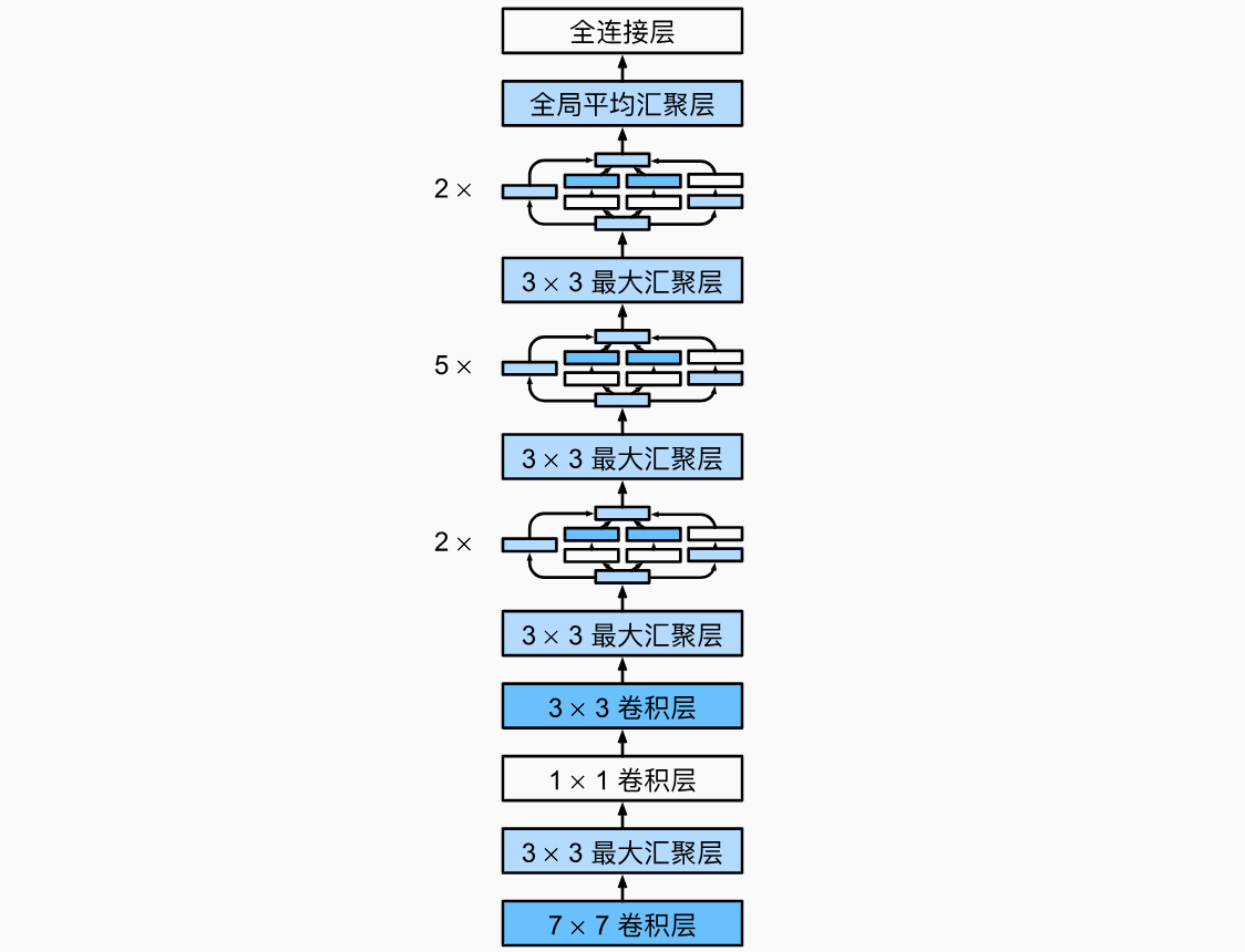 def b5(): return tf.keras.Sequential([ Inception(256, (160, 320), (32, 128), 128), Inception(384, (192, 384), (48, 128), 128), tf.keras.layers.GlobalAvgPool2D(), tf.keras.layers.Flatten() ])