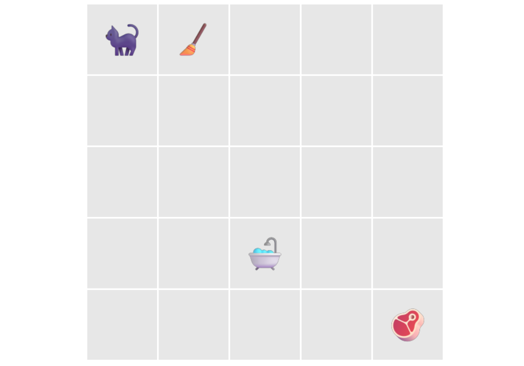 | 奖励模式: 1.移至另一个空单元格将导致奖励 0。2.移向扫帚将导致奖励 -1。3.移向浴缸将导致奖励 -10,猫会晕倒(剧集结束)。猫会再次重生在初始位置。4.移向肉将导致奖励 +100 |
