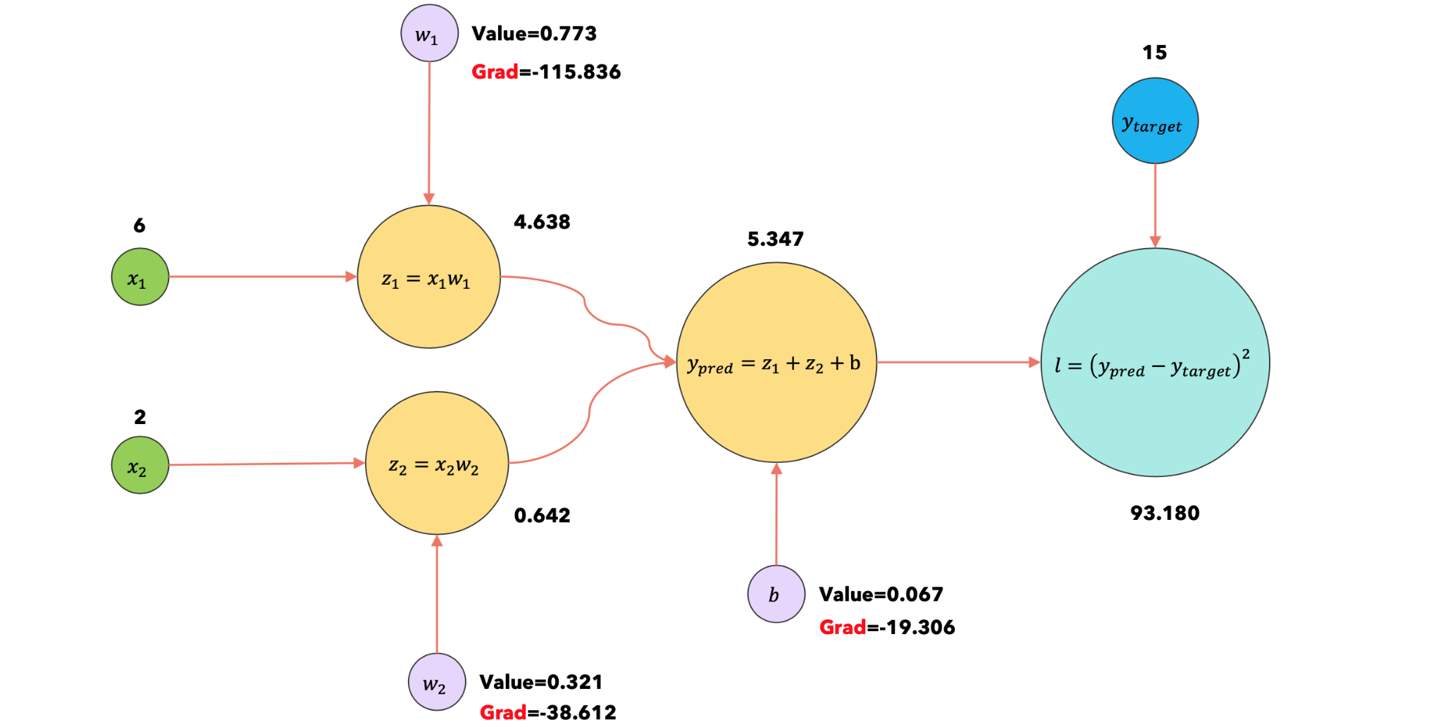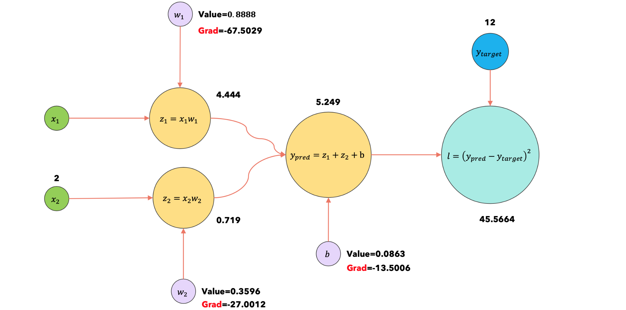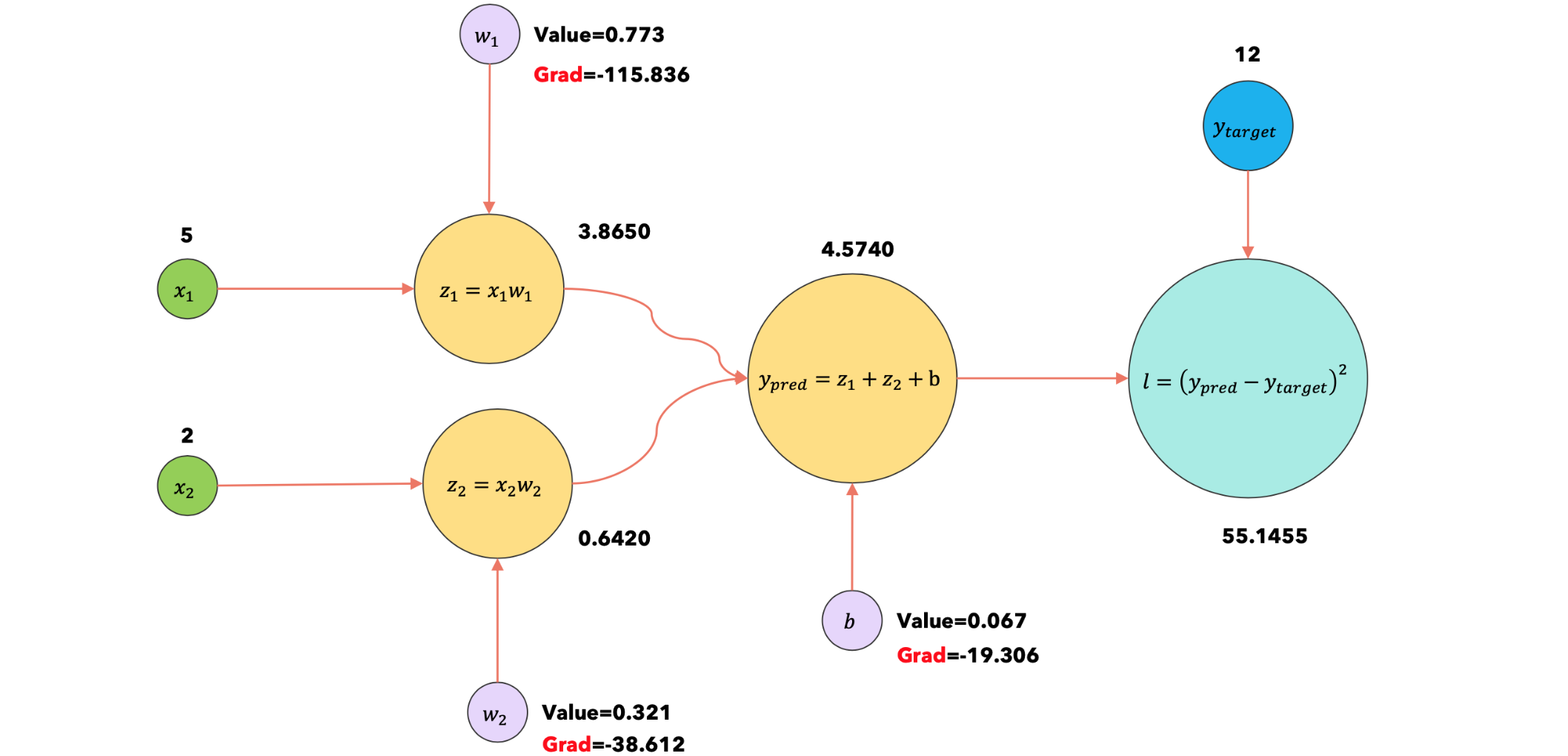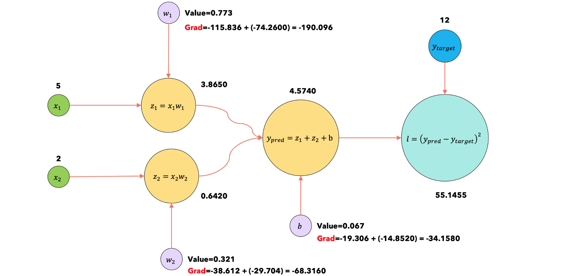 - 每个节点计算其局部梯度(计算图的每个节点的损失函数导数)。