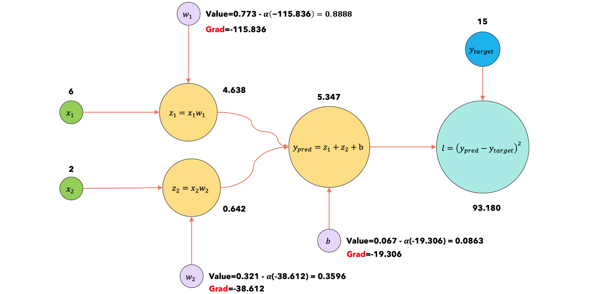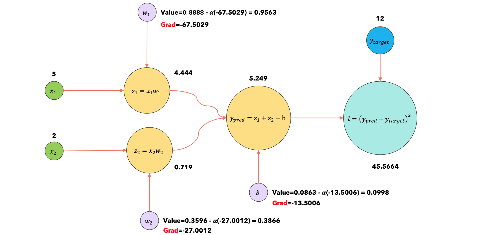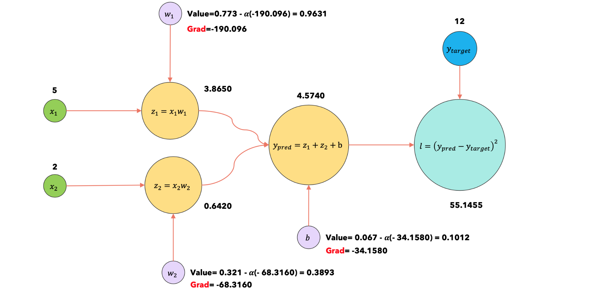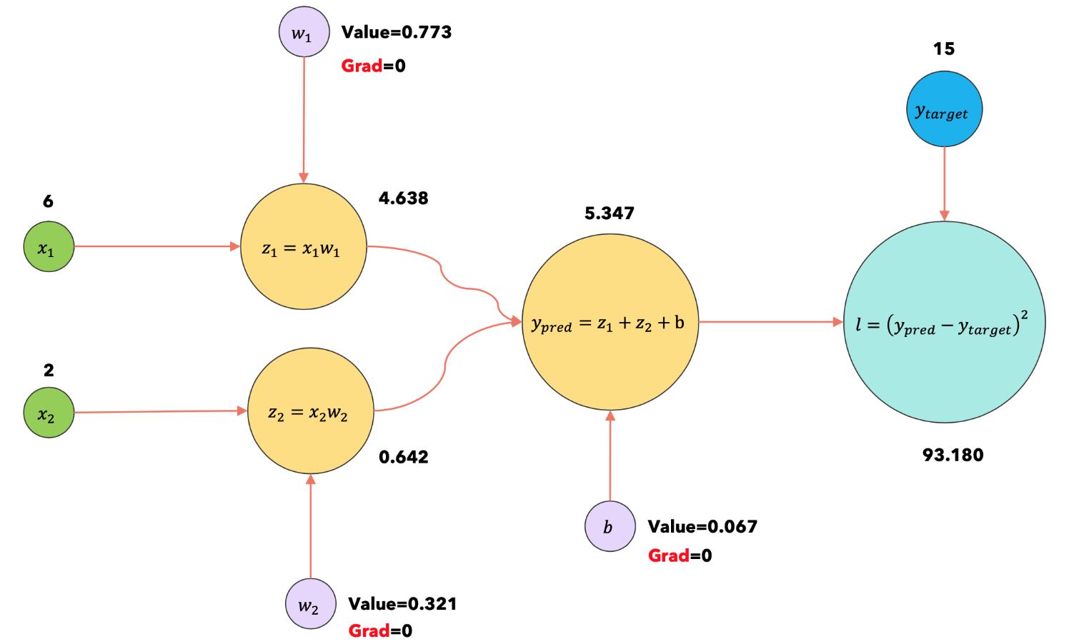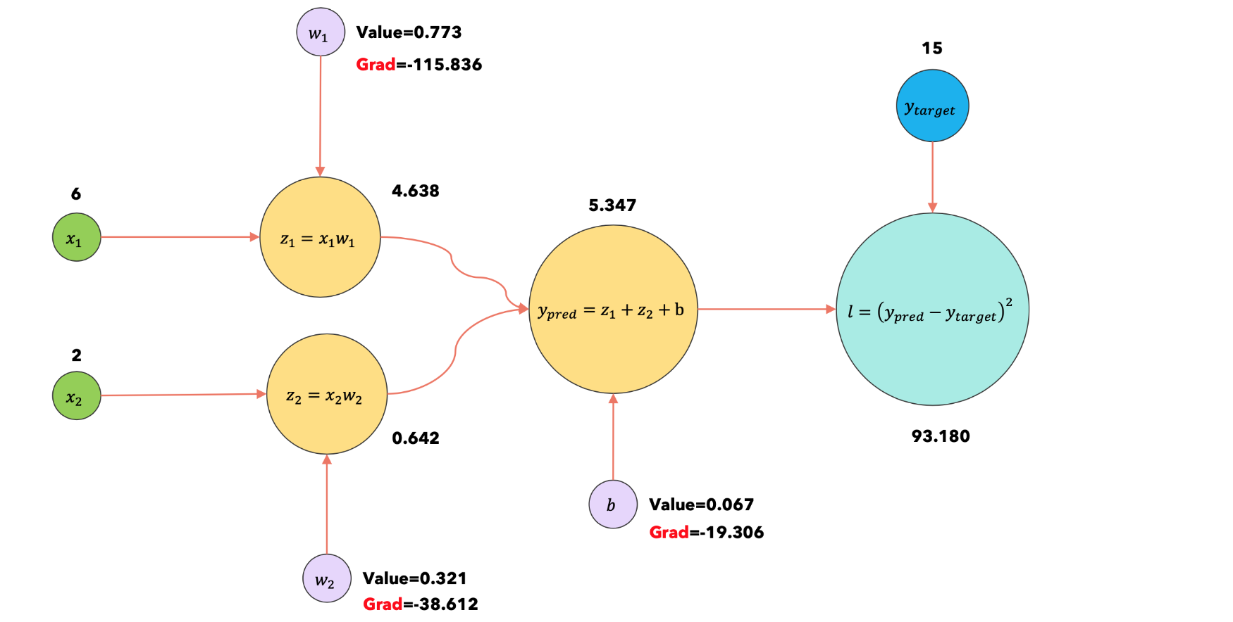- 每个节点计算其局部梯度(计算图的每个节点的损失函数导数)。