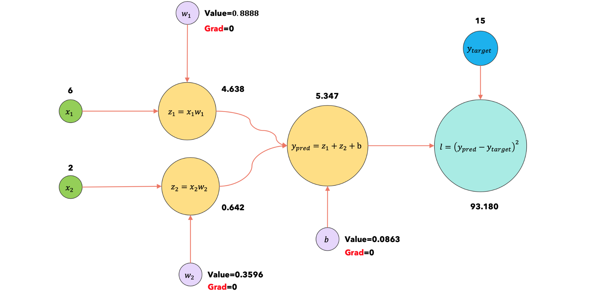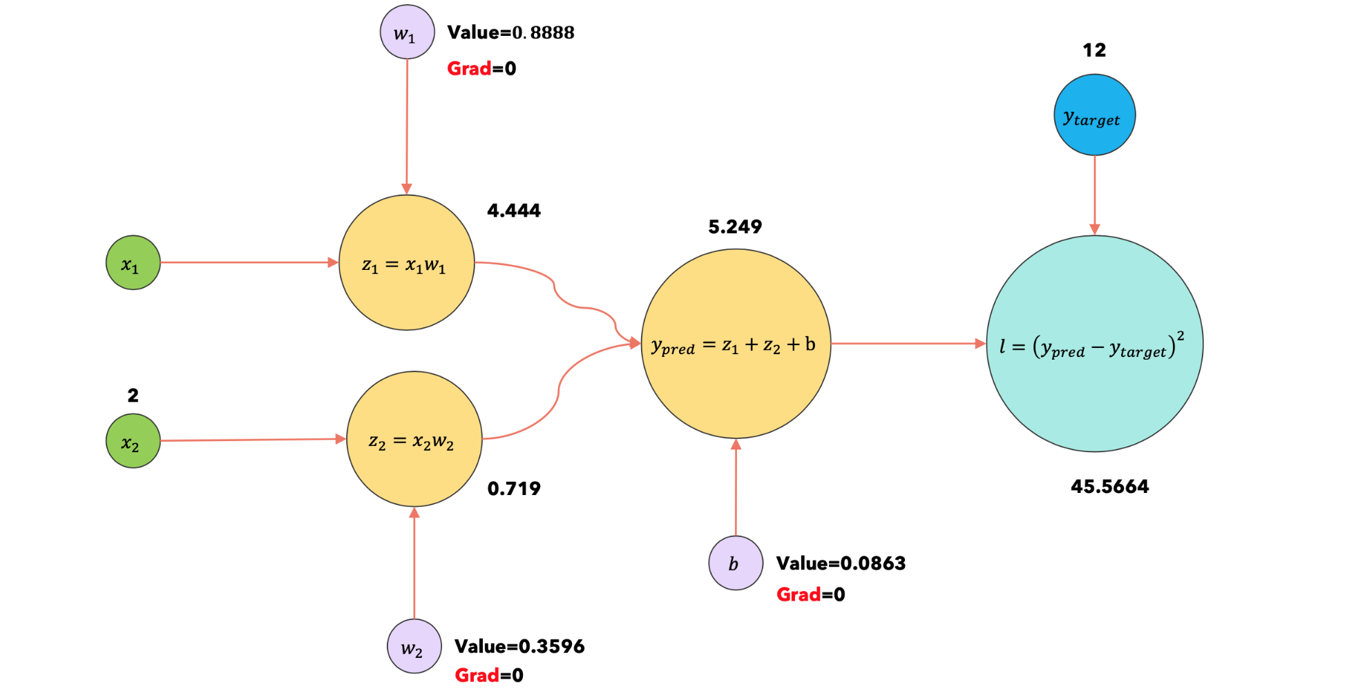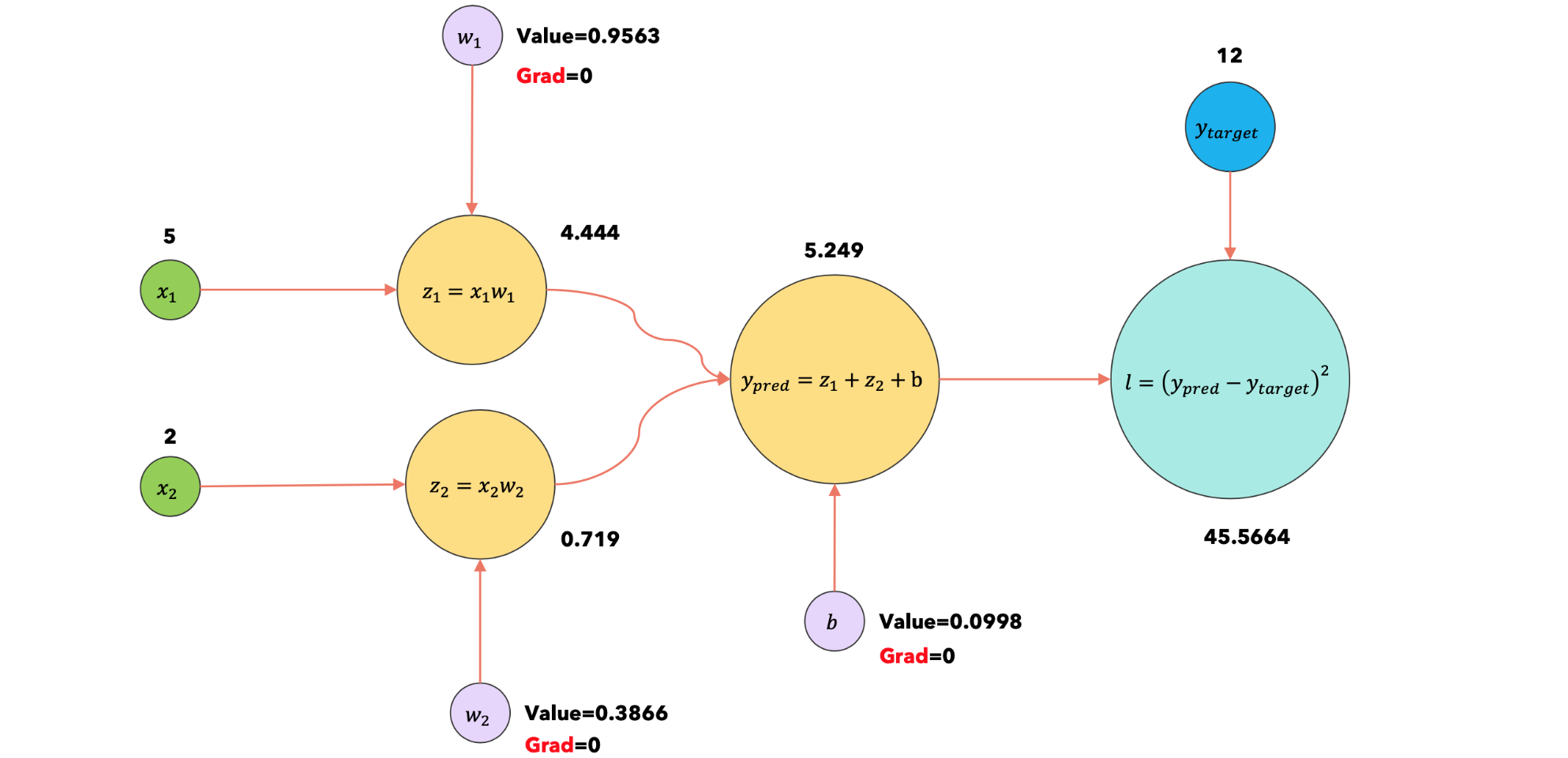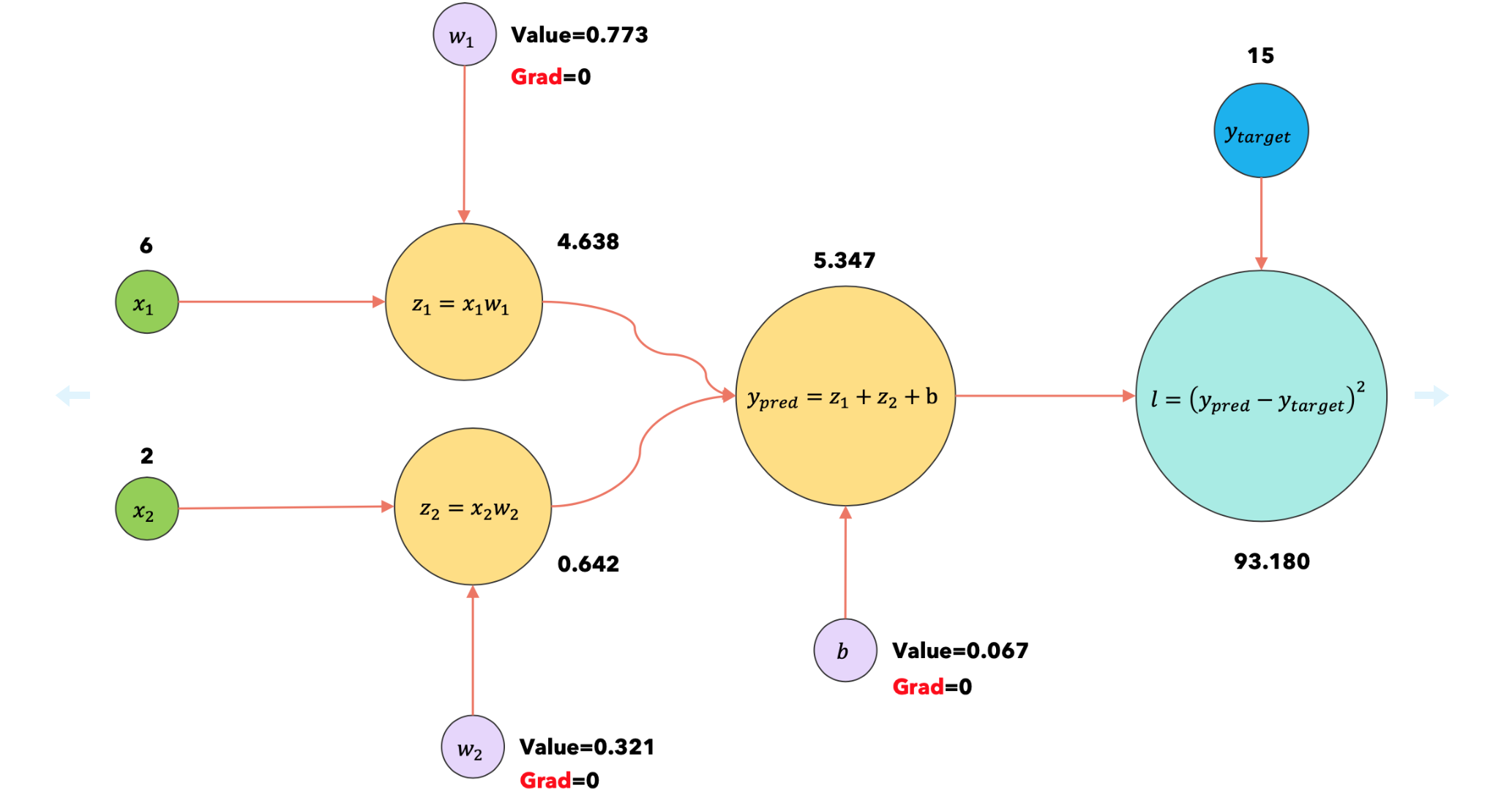 PyTorch会在节点梯度可用时立即将其传递。这样,在计算梯度时(下图中从右到左),PyTorch会将其传递给其他节点。