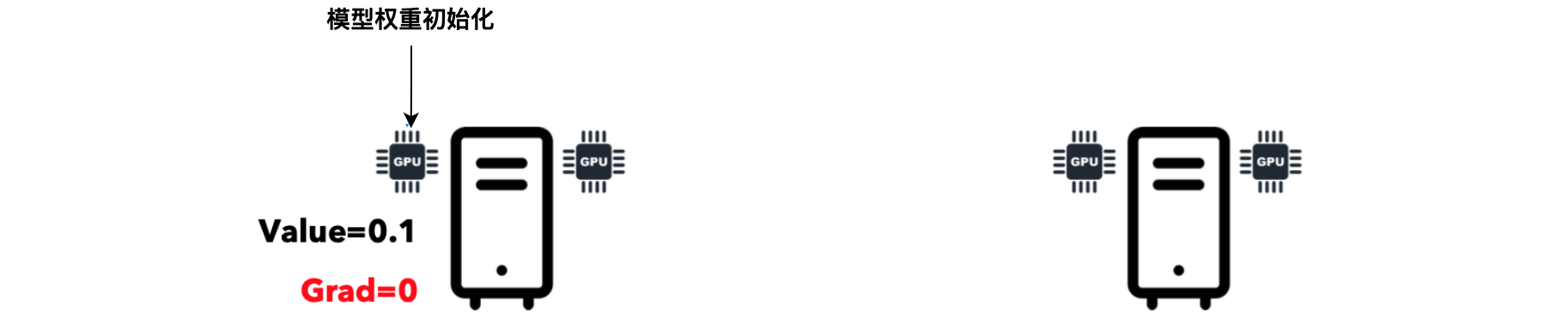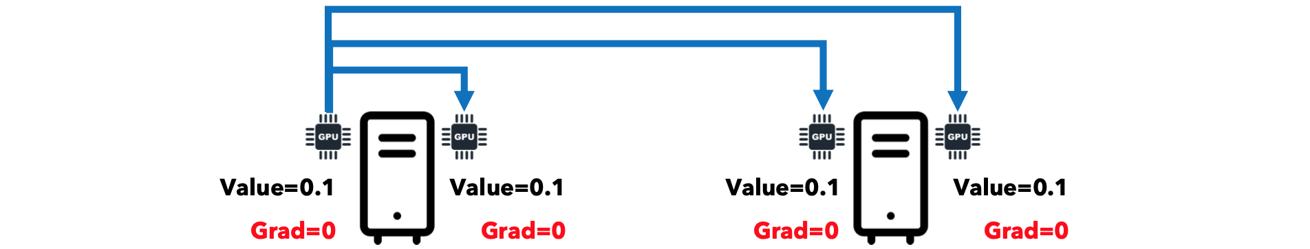 - 在训练开始时,模型的权重在一个节点上初始化,并发送到所有其他节点(广播)。