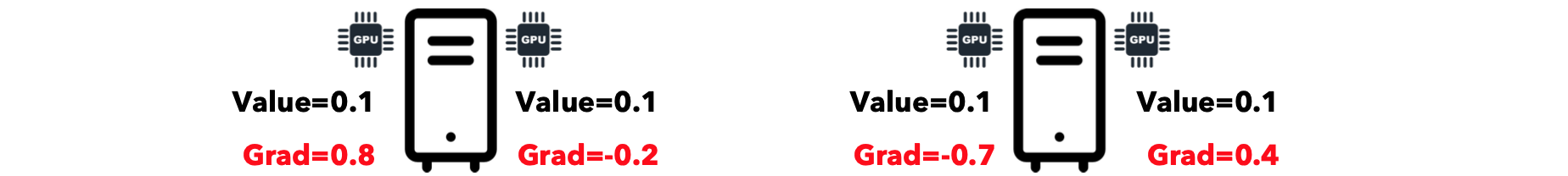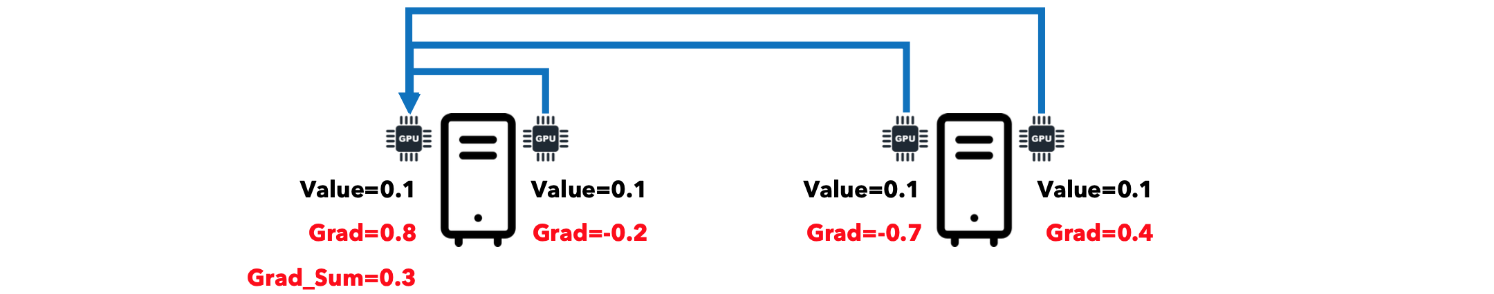 - 每个节点将其局部梯度发送到一个节点并接收累积梯度(