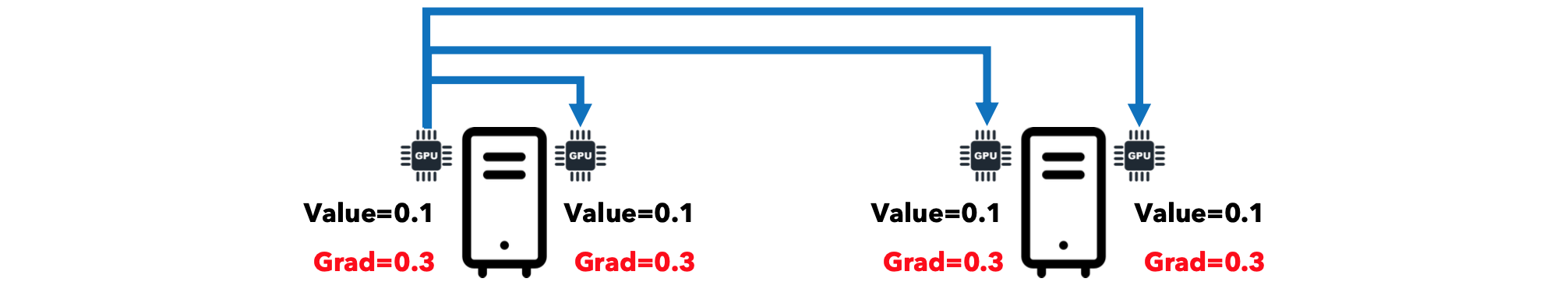 累积梯度被发送到所有其他节点(广播)。归约(Reduce)和广播(Broadcast)的序列被实现为单一操作(全归约,All-Reduce)。 |
