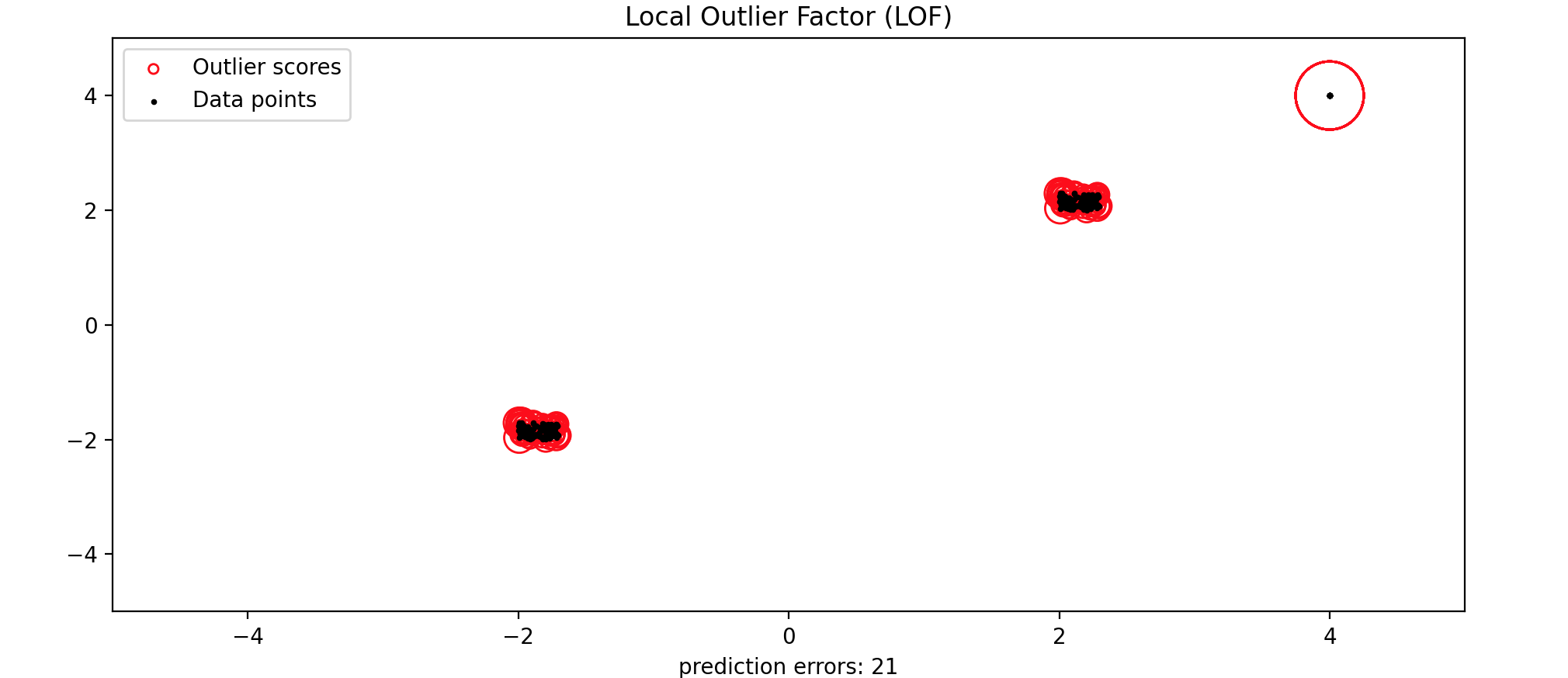 1 2 3 4 5 6 7 8 9 10 11 12 13 14 15 16 17 18 19 20 21 22 23 24 25 26 27 28 29 30 31 32 33 34 35 36 37 38 39 40 41 42 43 44 45 46 from matplotlib.legend_handler import HandlerPathCollectionimport matplotlib.pyplot as pltfrom sklearn.neighbors import LocalOutlierFactorimport numpy as npnp.random.seed(42 ) X_inliers = 0.3 * np.random.rand(100 , 2 ) X_inliers = np.r_[X_inliers + 2 , X_inliers - 2 ] X_outliers = np.random.uniform(low=4 , high=4 , size=(20 , 2 )) X = np.r_[X_inliers, X_outliers] n_outliers = len (X_outliers) ground_truth = np.ones(len (X), dtype=int ) ground_truth[-n_outliers] = -1 clf = LocalOutlierFactor(n_neighbors=20 , contamination=0.1 ) y_pred = clf.fit_predict(X) n_errors = (y_pred != ground_truth).sum () X_scores = clf.negative_outlier_factor_ def update_legend_marker_size (handle, orig ): "Customize size of the legend marker" handle.update_from(orig) handle.set_sizes([20 ]) radius = (X_scores.max () - X_scores) / (X_scores.max () - X_scores.min ()) scatter = plt.scatter( X[:, 0 ], X[:, 1 ], s=1000 * radius, edgecolors="r" , facecolors="none" , label="Outlier scores" , ) plt.scatter(X[:, 0 ], X[:, 1 ], color="k" , s=3.0 , label="Data points" ) plt.axis("tight" ) plt.xlim((-5 , 5 )) plt.ylim((-5 , 5 )) plt.xlabel("prediction errors: %d" % (n_errors)) plt.legend(handler_map={scatter: HandlerPathCollection(update_func=update_legend_marker_size)}) plt.title("Local Outlier Factor (LOF)" ) plt.show()
