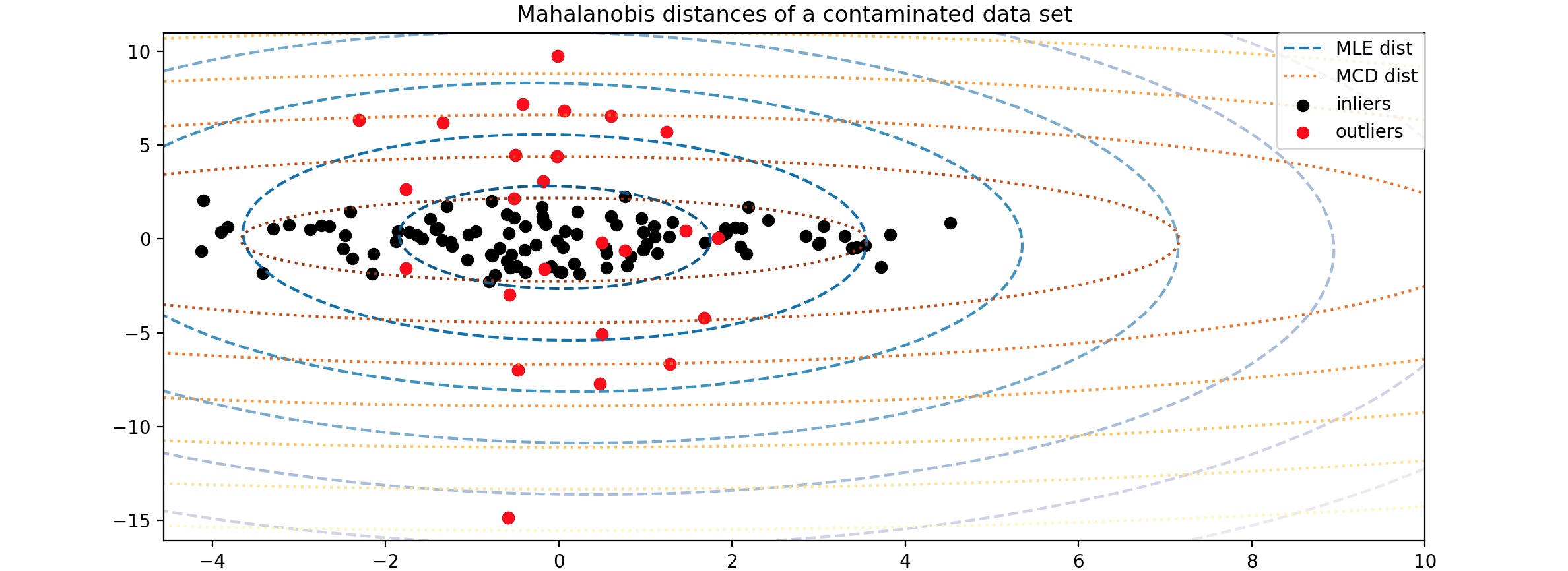这里的马哈拉诺比斯距离 计算公式: ,其中 是高斯分布的位置, 是高斯分布的协方差。最好使用鲁棒的协方差估计器 来保证估计值能够抵抗数据集中的“错误”观测值,并且计算出的马哈拉诺比斯距离 准确反映观测值的真实性。最小协方差行列式估计器 (MCD)是一个鲁棒的、高抗干扰能力的协方差估计器。MCD是为了找到 最小行列式的样本子集,从而计算出更准确的协方差矩阵。此示例说明了马哈拉诺比斯距离 如何受到异常数据的影响。当使用最大似然估计 (MLE)的马哈拉诺比斯距离 时,从污染分布中得出的观测值与来自真实高斯分布 的观测值无法得到区分。使用基于最小协方差行列式估计器 (MCD)的马哈拉诺比斯距离 ,这两个群体变得可以区分。