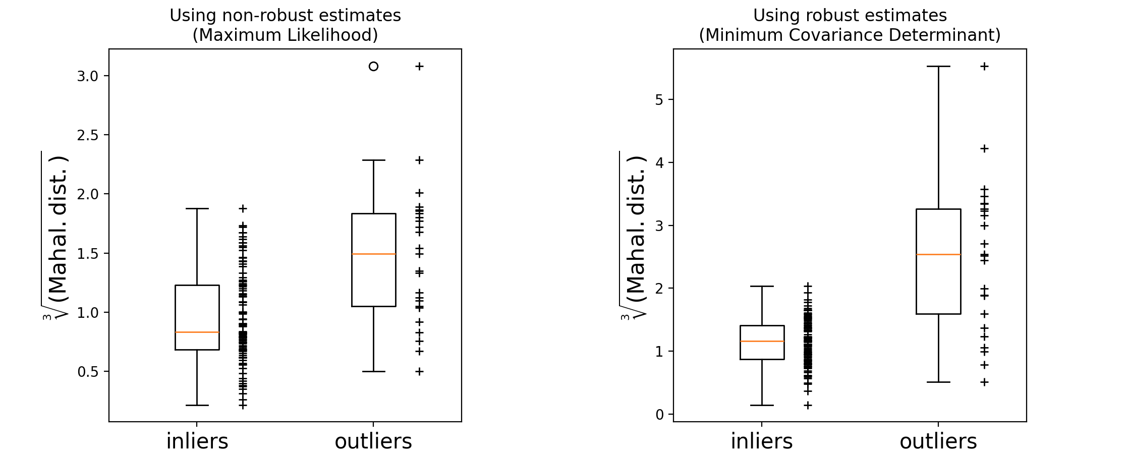 1 2 3 4 5 6 7 8 9 10 11 12 13 14 15 16 17 18 19 20 21 22 23 24 25 26 27 28 29 30 31 32 33 34 35 36 fig, (ax1, ax2) = plt.subplots(1 , 2 ) plt.subplots_adjust(wspace=0.6 ) emp_mahal = emp_cov.mahalanobis(X - np.mean(X, 0 )) ** (0.33 ) ax1.boxplot([emp_mahal[:-n_outliers], emp_mahal[-n_outliers:]], widths=0.25 ) ax1.plot( np.full(n_samples - n_outliers, 1.26 ), emp_mahal[:-n_outliers], "+k" , markeredgewidth=1 , ) ax1.plot(np.full(n_outliers, 2.26 ), emp_mahal[-n_outliers:], "+k" , markeredgewidth=1 ) ax1.axes.set_xticklabels(("inliers" , "outliers" ), size=15 ) ax1.set_ylabel(r"$\sqrt[3]{\rm{(Mahal. dist.)}}$" , size=16 ) ax1.set_title("Using non-robust estimates\n(Maximum Likelihood)" ) robust_mahal = robust_cov.mahalanobis(X - robust_cov.location_) ** (0.33 ) ax2.boxplot([robust_mahal[:-n_outliers], robust_mahal[-n_outliers:]], widths=0.25 ) ax2.plot( np.full(n_samples - n_outliers, 1.26 ), robust_mahal[:-n_outliers], "+k" , markeredgewidth=1 , ) ax2.plot(np.full(n_outliers, 2.26 ), robust_mahal[-n_outliers:], "+k" , markeredgewidth=1 ) ax2.axes.set_xticklabels(("inliers" , "outliers" ), size=15 ) ax2.set_ylabel(r"$\sqrt[3]{\rm{(Mahal. dist.)}}$" , size=16 ) ax2.set_title("Using robust estimates\n(Minimum Covariance Determinant)" ) plt.show()