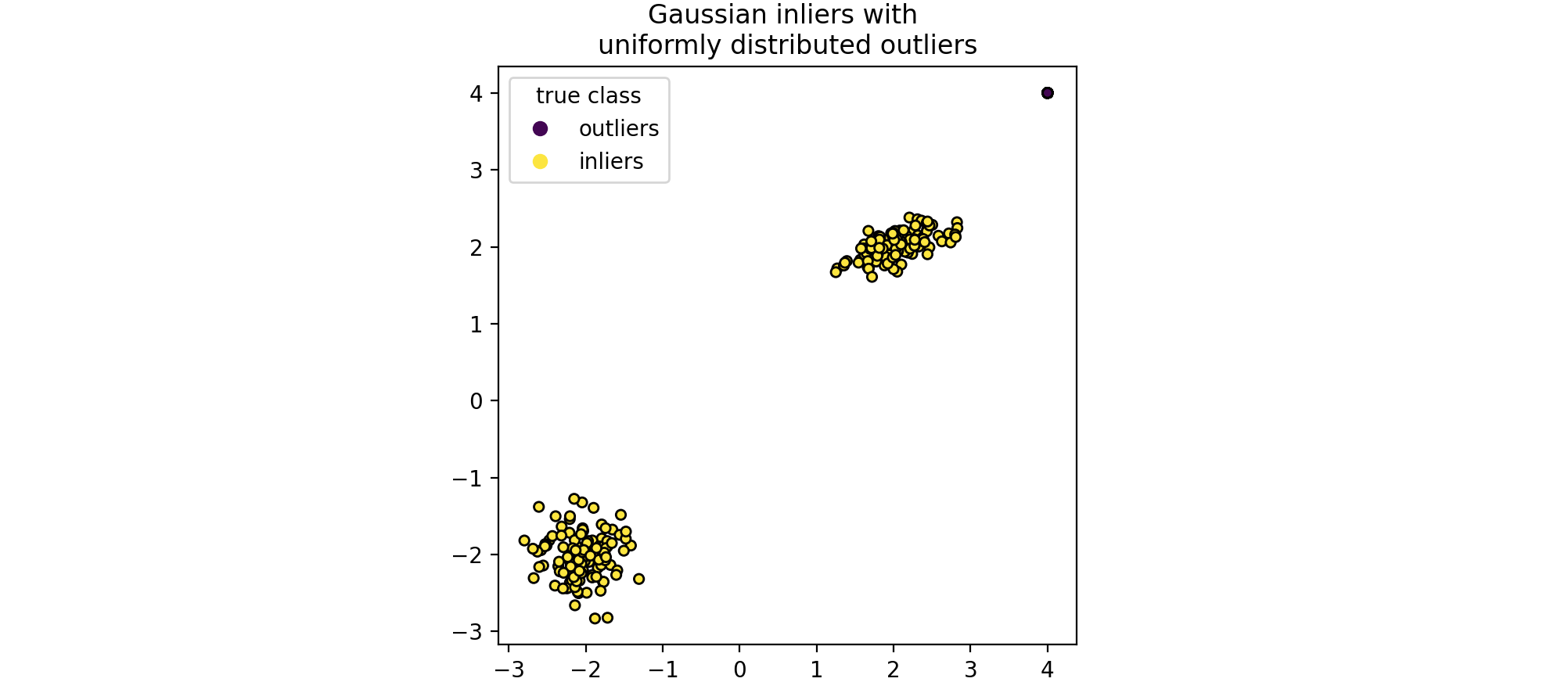 1 2 3 4 5 6 7 8 9 10 11 12 13 14 15 16 17 18 19 20 21 22 import numpy as npfrom sklearn.model_selection import train_test_splitimport matplotlib.pyplot as pltn_samples, n_outliers = 120 , 40 rng = np.random.RandomState(0 ) covariance = np.array([[0.5 , -0.1 ], [0.7 , 0.4 ]]) cluster_1 = 0.4 * rng.randn(n_samples, 2 ) @ covariance + np.array([2 , 2 ]) cluster_2 = 0.3 * rng.randn(n_samples, 2 ) + np.array([-2 , -2 ]) outliers = rng.uniform(low=-4 , high=4 , size=(n_outliers, 2 )) X = np.concatenate([cluster_1, cluster_2, outliers]) y = np.concatenate([np.ones((2 * n_samples), dtype=int ), -np.ones((n_outliers), dtype=int )]) X_train, X_test, y_train, y_test = train_test_split(X, y, stratify=y, random_state=42 ) scatter = plt.scatter(X[:, 0 ], X[:, 1 ], c=y, s=20 , edgecolor="k" ) handles, labels = scatter.legend_elements() plt.axis("square" ) plt.legend(handles=handles, labels=["outliers" , "inliers" ], title="true class" ) plt.title("Gaussian inliers with \nuniformly distributed outliers" ) plt.show()