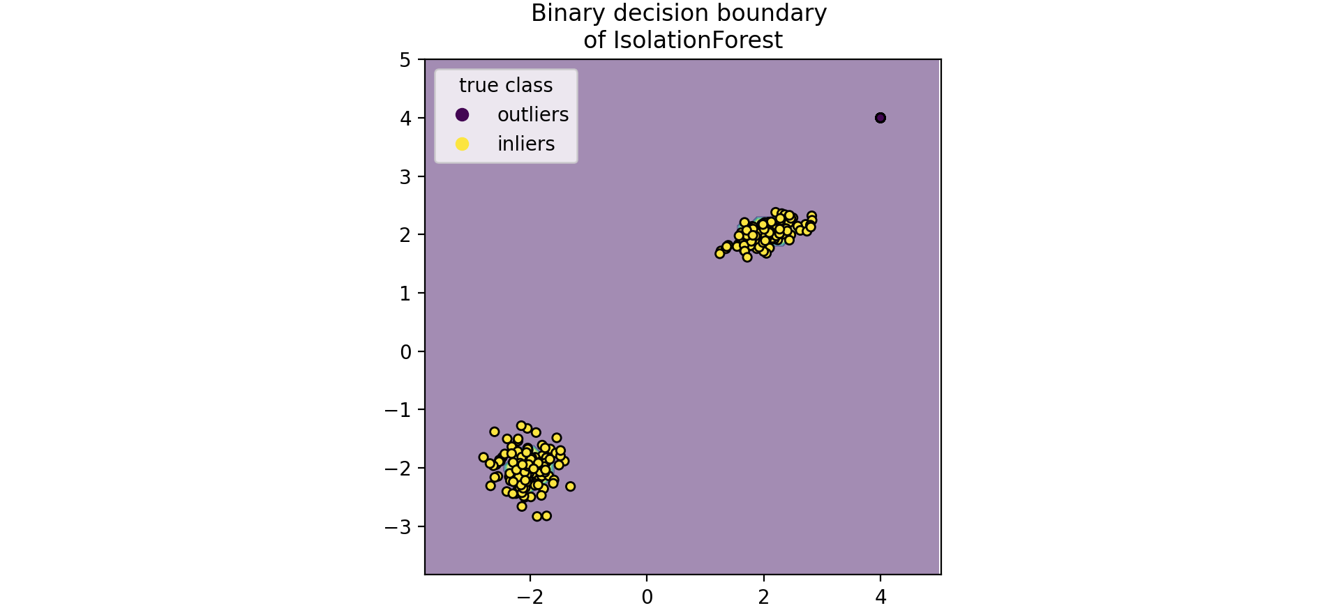 1 2 3 4 5 6 7 8 9 10 11 12 13 14 import matplotlib.pyplot as pltfrom sklearn.inspection import DecisionBoundaryDisplaydisp = DecisionBoundaryDisplay.from_estimator( clf, X, response_method="predict" , alpha=0.5 , ) disp.ax_.scatter(X[:, 0 ], X[:, 1 ], c=y, s=20 , edgecolor="k" ) disp.ax_.set_title("Binary decision boundary \nof IsolationForest" ) plt.axis("square" ) plt.legend(handles=handles, labels=["outliers" , "inliers" ], title="true class" ) plt.show()