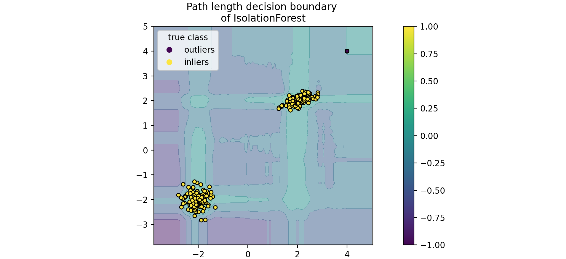 1 2 3 4 from sklearn.ensemble import IsolationForestclf = IsolationForest(max_samples=100 , random_state=0 ) clf.fit(X_train)