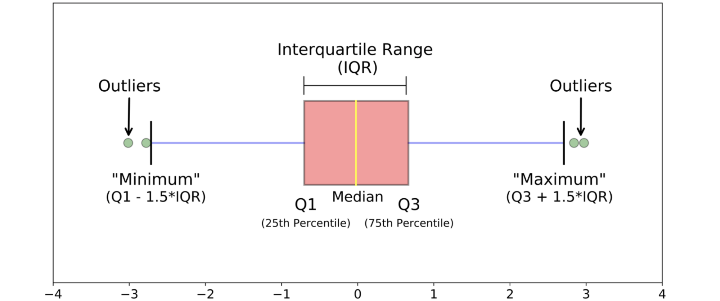 Tukey’s IQR方法 Tukey's IQR方法用于检测倾斜或非钟形数据中的异常值,因为它不做任何分布假设。但是,Tukey's IQR方法可能不适用于小样本量。一般规则是,任何不在(Q1 - 1.5IQR)~(Q3 + 1.5IQR)范围内的值都是异常值,可以删除。Tukey's IQR是通过将数据集划分为四个部分来衡量数据变异性的一种方法。具体来说:
