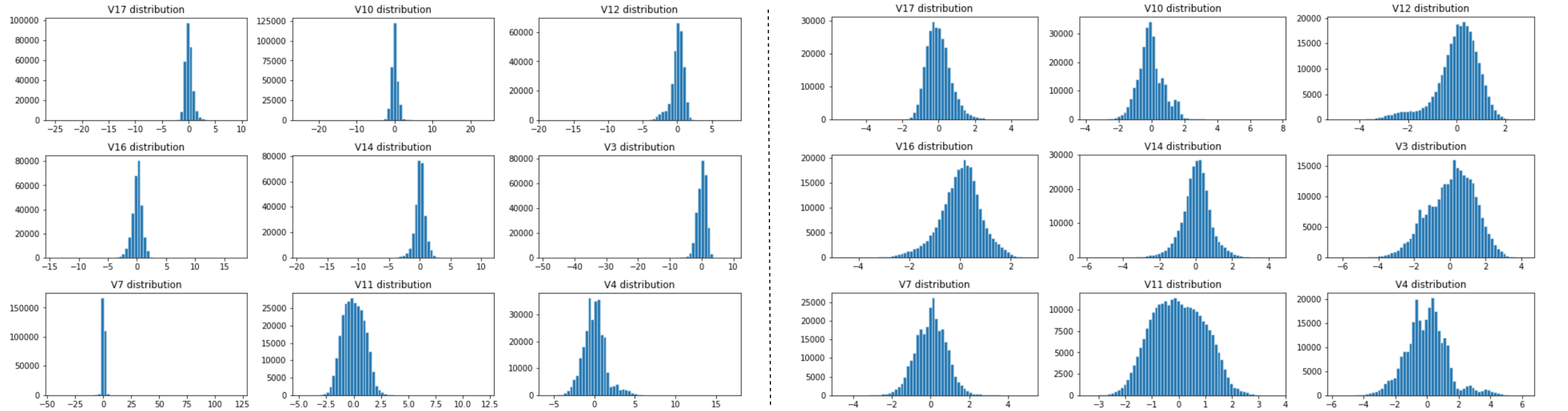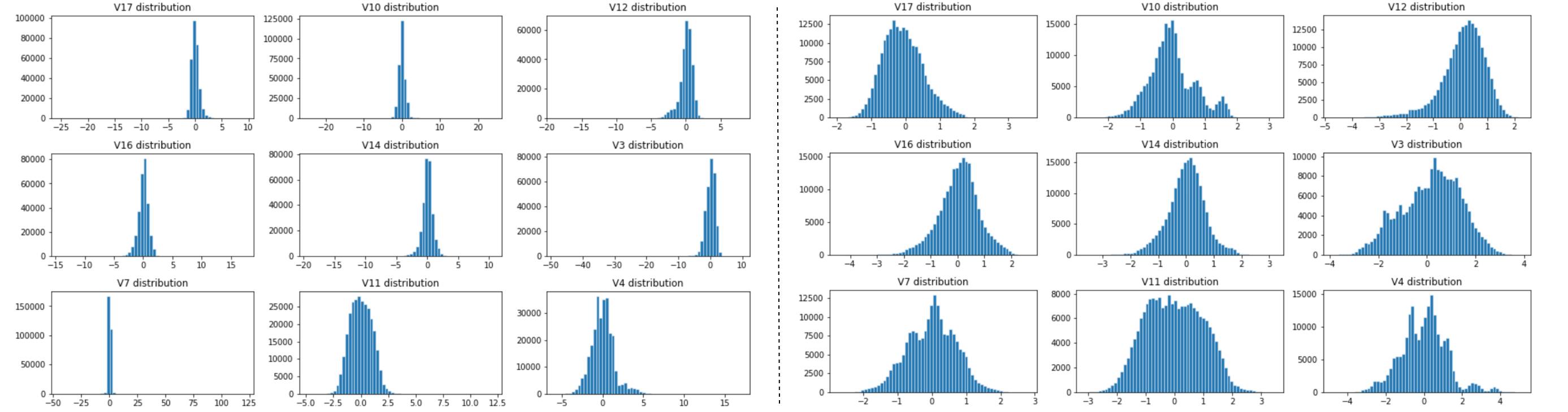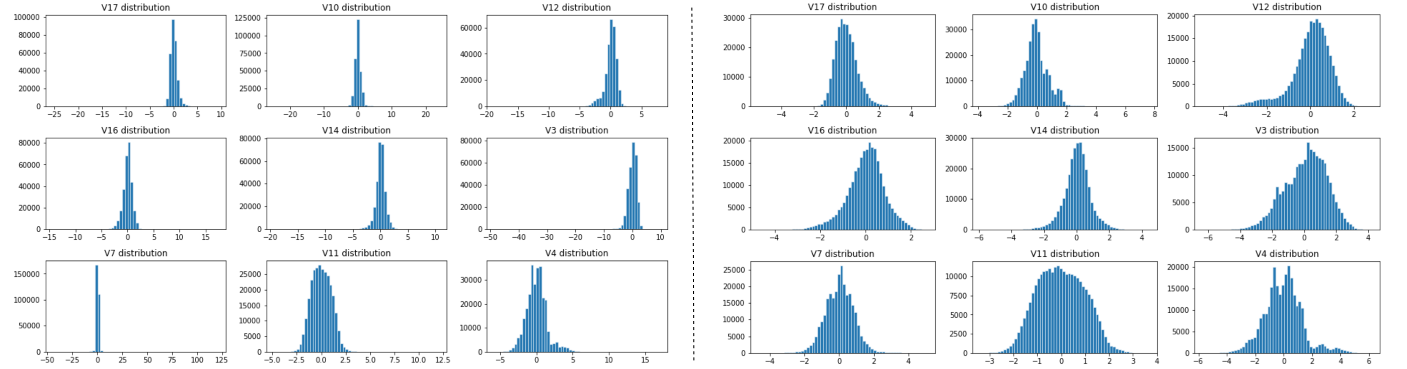 1 2 3 4 5 6 7 8 9 10 11 12 13 14 15 16 17 18 19 20 21 22 23 24 25 26 27 28 29 30 31 32 33 34 35 36 37 38 39 40 41 42 43 44 45 46 47 48 49 50 51 52 53 54 55 56 57 58 59 60 61 62 63 64 65 66 67 68 69 70 71 72 73 74 75 76 77 78 79 80 81 82 import numpy as npimport pandas as pdimport seaborn as snsfrom matplotlib import pyplot as pltfrom collections import Counterdf_raw = pd.read_csv('../input/fraud-detection/creditcard.csv' ) df=df_raw.drop(['Time' ], axis=1 ) feature_list = ['V1' , 'V2' , 'V3' , 'V4' , 'V5' , 'V6' , 'V7' , 'V8' , 'V9' , 'V10' , 'V11' ,'V12' , 'V13' , 'V14' , 'V15' , 'V16' , 'V17' , 'V18' , 'V19' , 'V20' , 'V21' ,'V22' , 'V23' , 'V24' , 'V25' , 'V26' , 'V27' , 'V28' , 'Amount' ] def z_score_method (df,n,features): """ Takes a dataframe df of features and returns an index list corresponding to the observations containing more than n outliers according to the z-score method. """ outlier_list = [] for column in features: data_mean = df[column].mean() data_std = df[column].std() threshold = 3 z_score = abs ( (df[column] - data_mean)/data_std ) outlier_list_column = df[z_score > threshold].index outlier_list.extend(outlier_list_column) outlier_list = Counter(outlier_list) multiple_outliers = list ( k for k, v in outlier_list.items() if v > n ) df1 = df[z_score > threshold] print ('Total number of outliers is:' , df1.shape[0 ]) return multiple_outliers Outliers_z_score = z_score_method(df,1 ,feature_list) df_out3 = df.drop(Outliers_z_score, axis = 0 ).reset_index(drop=True ) fig, axes = plt.subplots(nrows=3 , ncols=3 ,figsize=(13 ,8 )) fig.suptitle('Distributions of most important features after dropping outliers using z-score\n' , size = 18 ) axes[0 ,0 ].hist(df_out3['V17' ], bins=60 , linewidth=0.5 , edgecolor="white" ) axes[0 ,0 ].set_title("V17 distribution" ); axes[0 ,1 ].hist(df_out3['V10' ], bins=60 , linewidth=0.5 , edgecolor="white" ) axes[0 ,1 ].set_title("V10 distribution" ); axes[0 ,2 ].hist(df_out3['V12' ], bins=60 , linewidth=0.5 , edgecolor="white" ) axes[0 ,2 ].set_title("V12 distribution" ); axes[1 ,0 ].hist(df_out3['V16' ], bins=60 , linewidth=0.5 , edgecolor="white" ) axes[1 ,0 ].set_title("V16 distribution" ); axes[1 ,1 ].hist(df_out3['V14' ], bins=60 , linewidth=0.5 , edgecolor="white" ) axes[1 ,1 ].set_title("V14 distribution" ); axes[1 ,2 ].hist(df_out3['V3' ], bins=60 , linewidth=0.5 , edgecolor="white" ) axes[1 ,2 ].set_title("V3 distribution" ); axes[2 ,0 ].hist(df_out3['V7' ], bins=60 , linewidth=0.5 , edgecolor="white" ) axes[2 ,0 ].set_title("V7 distribution" ); axes[2 ,1 ].hist(df_out3['V11' ], bins=60 , linewidth=0.5 , edgecolor="white" ) axes[2 ,1 ].set_title("V11 distribution" ); axes[2 ,2 ].hist(df_out3['V4' ], bins=60 , linewidth=0.5 , edgecolor="white" ) axes[2 ,2 ].set_title("V4 distribution" ); plt.tight_layout() plt.show()