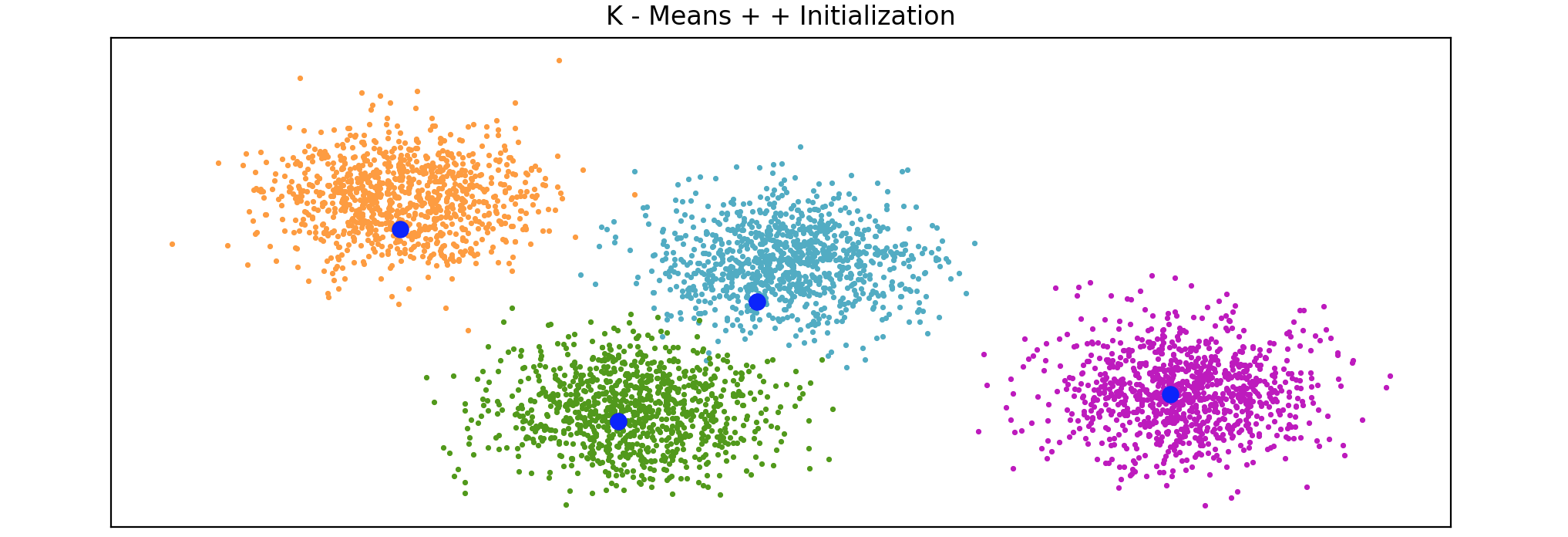 1 2 3 4 5 6 7 8 9 10 11 12 13 14 15 16 17 18 19 20 21 22 23 24 25 26 import matplotlib.pyplot as pltfrom sklearn.cluster import kmeans_plusplusfrom sklearn.datasets import make_blobsn_samples = 4000 n_components = 4 X, y_true = make_blobs(n_samples=n_samples, centers=n_components, cluster_std=0.6 , random_state=0 ) X = X[:, ::-1 ] centers_init, indices = kmeans_plusplus(X, n_clusters=4 , random_state=0 ) plt.figure(1 ) colors = ["#4EACC5" , "#FF9C34" , "#4E9A06" , "m" ] for k, col in enumerate (colors): cluster_data = y_true == k plt.scatter(X[cluster_data, 0 ], X[cluster_data, 1 ], c=col, marker="." , s=10 ) plt.scatter(centers_init[:, 0 ], centers_init[:, 1 ], c='b' , s=50 ) plt.title("K - Means + + Initialization" ) plt.xticks([]) plt.yticks([]) plt.show()