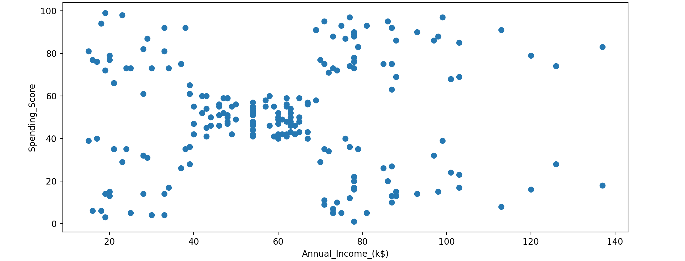 1 2 3 4 plt.scatter(customer_data['Annual_Income_(k$)' ], customer_data['Spending_Score' ]) plt.xlabel('Annual_Income_(k$)' ) plt.ylabel('Spending_Score' ) plt.show()