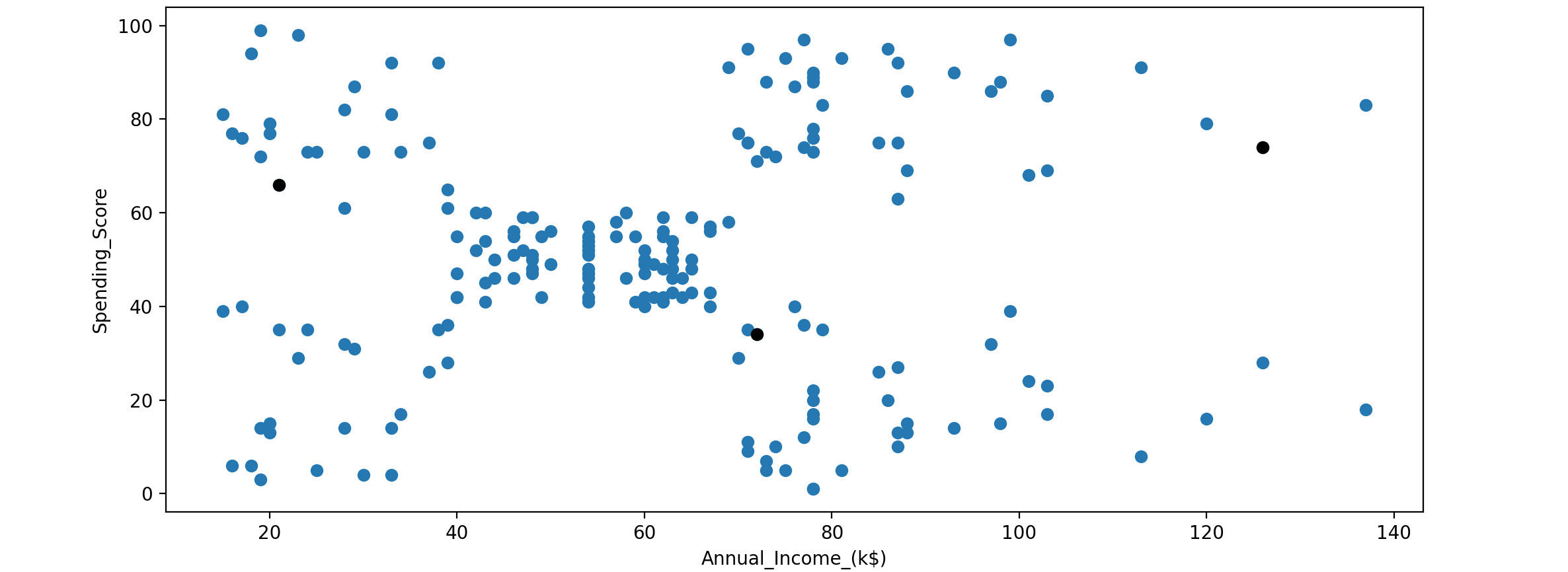 1 2 3 4 5 6 centroids = customer_data.sample(n=3 ) plt.scatter(customer_data['Annual_Income_(k$)' ], customer_data['Spending_Score' ]) plt.scatter(centroids['Annual_Income_(k$)' ], centroids['Spending_Score' ], c='black' ) plt.xlabel('Annual_Income_(k$)' ) plt.ylabel('Spending_Score' ) plt.show()