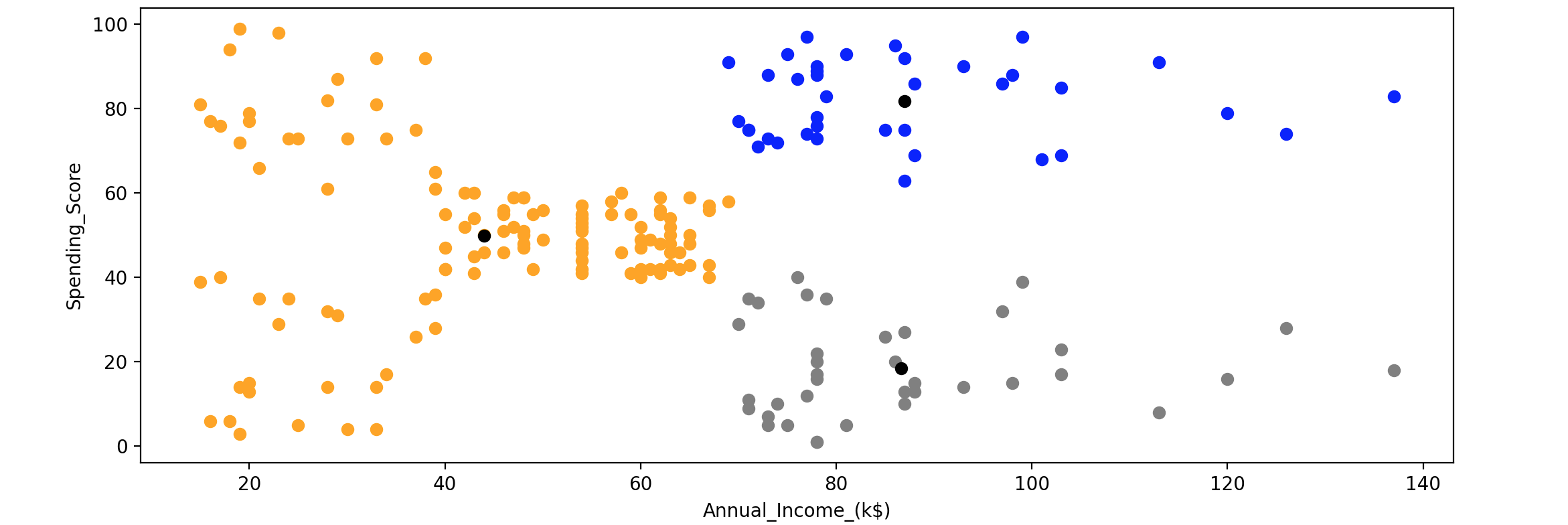 1 2 3 4 5 6 7 8 9 10 11 12 13 14 15 16 17 18 19 20 21 22 23 24 25 26 27 28 29 30 31 32 33 34 35 36 37 38 39 40 41 42 43 44 45 K = 3 centroids = customer_data.sample(n=K) mask = customer_data['CustomerID' ].isin(centroids.CustomerID.tolist()) X = customer_data[~mask] diff = 1 j = 0 XD = X while (diff != 0 ): i = 1 for index1, row_c in centroids.iterrows(): ED = [] for index2, row_d in XD.iterrows(): d1 = (row_c["Annual_Income_(k$)" ] - row_d["Annual_Income_(k$)" ])**2 d2 = (row_c["Spending_Score" ] - row_d["Spending_Score" ])**2 d = np.sqrt(d1 + d2) ED.append(d) X[i] = ED i = i + 1 C = [] for index, row in X.iterrows(): min_dist = row[1 ] pos = 1 for i in range (K): if row[i + 1 ] < min_dist: min_dist = row[i + 1 ] pos = i + 1 C.append(pos) X["Cluster" ] = C centroids_new = X.groupby(["Cluster" ]).mean()[["Spending_Score" , "Annual_Income_(k$)" ]] if j == 0 : diff = 1 j = j + 1 else : diff = (centroids_new['Spending_Score' ] - centroids['Spending_Score' ]).sum () + (centroids_new['Annual_Income_(k$)' ] - centroids['Annual_Income_(k$)' ]).sum () centroids = X.groupby(["Cluster" ]).mean()[["Spending_Score" , "Annual_Income_(k$)" ]] color = ['grey' , 'blue' , 'orange' ] for k in range (K): data = X[X["Cluster" ] == k + 1 ] plt.scatter(data["Annual_Income_(k$)" ], data["Spending_Score" ], c=color[k]) plt.scatter(centroids["Annual_Income_(k$)" ], centroids["Spending_Score" ], c='black' ) plt.xlabel('Annual_Income_(k$)' ) plt.ylabel('Spending_Score' ) plt.show()
