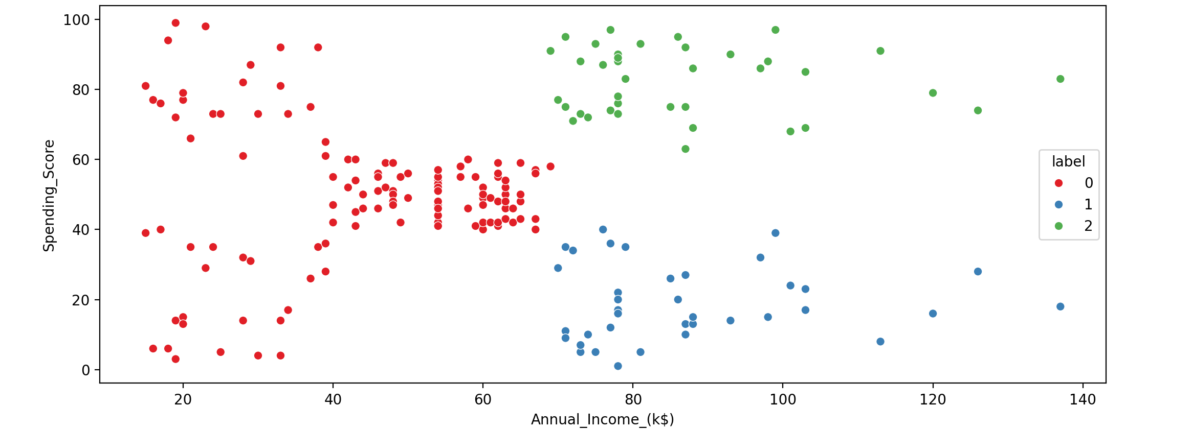 1 2 3 4 5 6 7 8 9 import seaborn as snsfrom sklearn.cluster import KMeanskm_sample = KMeans(n_clusters=3 ) km_sample.fit(customer_data[['Annual_Income_(k$)' ,'Spending_Score' ]]) labels_sample = km_sample.labels_ customer_data['label' ] = labels_sample sns.scatterplot(customer_data['Annual_Income_(k$)' ],customer_data['Spending_Score' ],hue=customer_data['label' ],palette='Set1' )