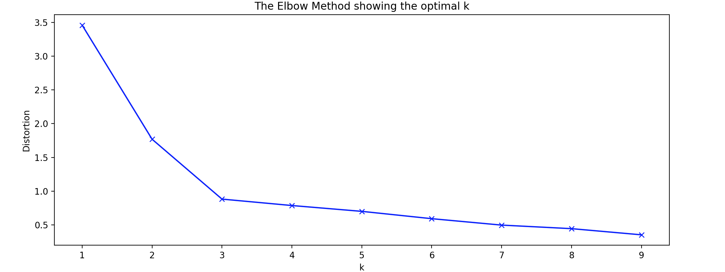 肘部法 (Elbow Method):距离度量是比较不同 值结果的常用度量之一。当簇数 增加时,质心到数据点的距离将减小,并达到 与数据点数相同的点。这就是我们一直使用到质心的距离平均值的原因。在肘部法 (Elbow Method)中,绘制平均距离并寻找减少率发生变化的肘点 。这个肘点可用于确定 。 肘点在数学优化中用作终止点,决定在哪个点收益递减不再值得额外花费。在聚类 中,当添加另一个聚类不会改善建模结果时,它用于选择一定数量的聚类。这是一个迭代过程,其中将对数据集进行K-means聚类 , 值的范围如下:使用所有 值执行K-means聚类 。对于每个 值,计算所有数据点到质心的平均距离,绘制每个点并找到平均距离突然下降的点(肘部),代码实现如下:1 2 3 4 5 6 7 8 9 10 11 12 13 14 15 16 17 18 19 20 21 22 23 24 25 from sklearn.cluster import KMeansfrom sklearn import metricsfrom scipy.spatial.distance import cdistimport numpy as npimport matplotlib.pyplot as pltx1 = np.array([3 , 1 , 1 , 2 , 1 , 6 , 6 , 6 , 5 , 6 , 7 , 8 , 9 , 8 , 9 , 9 , 8 ]) x2 = np.array([5 , 4 , 5 , 6 , 5 , 8 , 6 , 7 , 6 , 7 , 1 , 2 , 1 , 2 , 3 , 2 , 3 ]) X = np.array(list (zip (x1, x2))).reshape(len (x1), 2 ) distortions = [] K = range (1 ,10 ) for k in K: kmeanModel = KMeans(n_clusters=k).fit(X) kmeanModel.fit(X) distortions.append(sum (np.min (cdist(X, kmeanModel.cluster_centers_, 'euclidean' ), axis=1 )) / X.shape[0 ]) plt.plot(K, distortions, 'bx-' ) plt.xlabel('k' ) plt.ylabel('Distortion' ) plt.title('The Elbow Method showing the optimal k' ) plt.show()