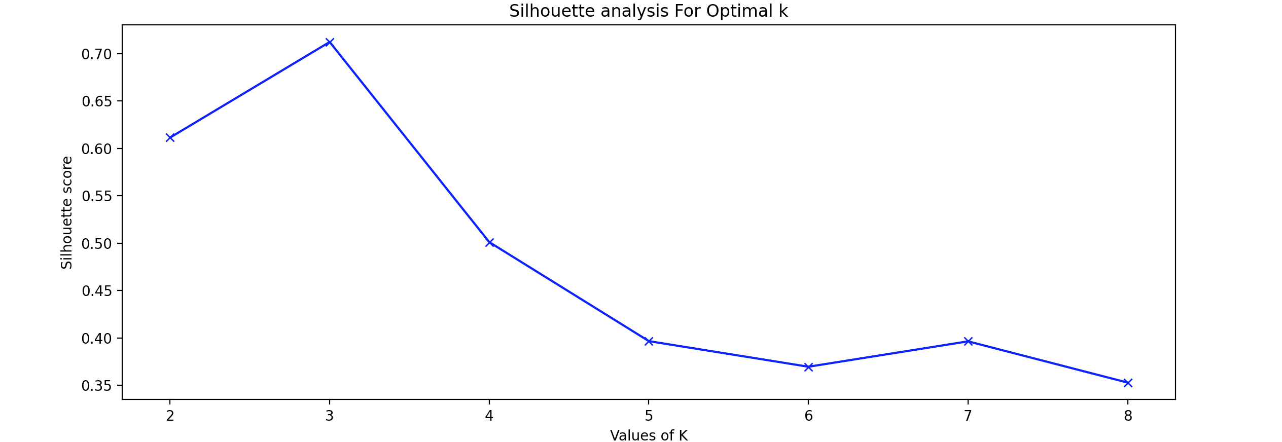 轮廓法 (Silhouette):轮廓法 是指一种解释和验证数据集群内一致性的方法。该技术以简洁的图形表示每个对象的分类情况。轮廓系数 用于通过检查某个簇内的数据点与其他簇的相似程度来衡量簇的质量。轮廓分析 可用于研究簇之间的距离。此离散测量值介于-1和1之间:+1:表示数据点距离相邻簇较远,因此位置最佳。0:表示它位于两个相邻集群之间的决策边界上。-1:表示数据点被分配到错误的簇。为了找到聚类数 的最优值,使用轮廓图来显示一个聚类中每个点与相邻聚类中某个点的接近程度,从而提供一种直观评估聚类数等参数的方法。针对一系列值计算K-means聚类 算法,对于 的每个值,找到数据点的平均轮廓分数:1 2 3 4 5 6 7 8 9 10 11 12 13 14 15 16 from sklearn.metrics import silhouette_scoresil_avg = [] range_n_clusters = [2 , 3 , 4 , 5 , 6 , 7 , 8 ] for k in range_n_clusters: kmeans = KMeans(n_clusters = k).fit(X) labels = kmeans.labels_ sil_avg.append(silhouette_score(X, labels, metric = 'euclidean' )) plt.plot(range_n_clusters,sil_avg,'bx-' ) plt.xlabel('Values of K' ) plt.ylabel('Silhouette score' ) plt.title('Silhouette analysis For Optimal k' ) plt.show()