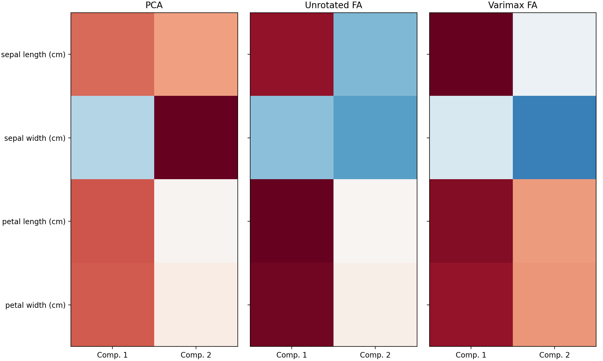 1 2 3 4 5 6 7 8 9 10 11 12 13 14 15 16 17 18 19 20 21 22 23 24 25 26 27 28 29 30 31 32 33 34 35 36 37 38 39 40 41 42 43 44 45 46 47 48 49 50 51 import numpy as npimport matplotlib.pyplot as pltfrom sklearn.datasets import load_irisfrom sklearn.preprocessing import StandardScalerfrom sklearn.decomposition import PCA, FactorAnalysisdata = load_iris() X = StandardScaler().fit_transform(data["data" ]) feature_names = data["feature_names" ] ax = plt.axes() ax.set_xticks([0 , 1 , 2 , 3 ]) ax.set_xticklabels(list (feature_names), rotation=90 ) ax.set_yticks([0 , 1 , 2 , 3 ]) ax.set_yticklabels(list (feature_names)) im = ax.imshow(np.corrcoef(X.T), cmap="RdBu_r" , vmin=-1 , vmax=1 ) plt.colorbar(im).ax.set_ylabel("$r$" , rotation=0 ) ax.set_title("Iris feature correlation matrix" ) plt.tight_layout() n_comps = 2 methods = [ ("PCA" , PCA()), ("Unrotated FA" , FactorAnalysis()), ("Varimax FA" , FactorAnalysis(rotation="varimax" )), ] fig, axes = plt.subplots(ncols=len (methods), figsize=(10 , 8 ), sharey=True ) for ax, (method, fa) in zip (axes, methods): fa.set_params(n_components=n_comps) fa.fit(X) components = fa.components_.T print ("\n\n %s :\n" % method) print (components) vmax = np.abs (components).max () ax.imshow(components, cmap="RdBu_r" , vmax=vmax, vmin=-vmax) ax.set_yticks(np.arange(len (feature_names))) ax.set_yticklabels(feature_names) ax.set_title(str (method)) ax.set_xticks([0 , 1 ]) ax.set_xticklabels(["Comp. 1" , "Comp. 2" ]) fig.suptitle("Factors" ) plt.tight_layout() plt.show()