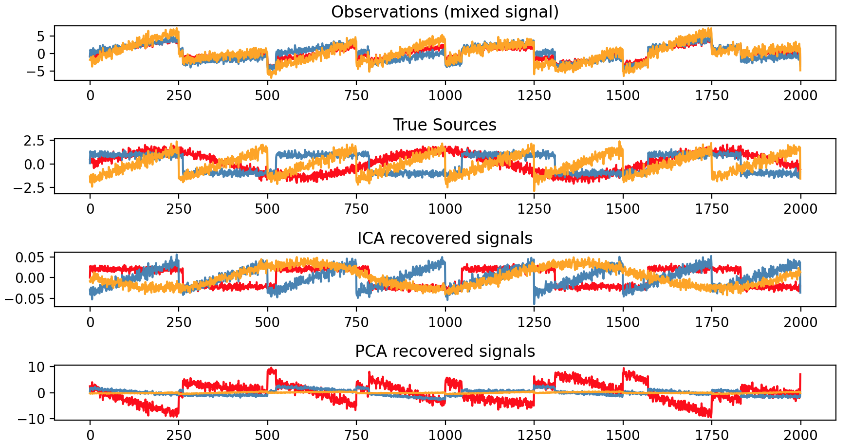 1 2 3 4 5 6 7 8 9 10 11 12 13 14 15 16 17 18 19 20 21 22 23 24 25 26 27 28 29 30 31 32 33 34 35 36 37 38 39 40 41 42 43 44 45 46 import numpy as npimport matplotlib.pyplot as pltfrom scipy import signalfrom sklearn.decomposition import PCA, FastICAnp.random.seed(0 ) n_samples = 2000 time = np.linspace(0 , 8 , n_samples) s1 = np.sin(2 * time) s2 = np.sign(np.sin(3 * time)) s3 = signal.sawtooth(2 * np.pi * time) S = np.c_[s1, s2, s3] S += 0.2 * np.random.normal(size=S.shape) S /= S.std(axis=0 ) A = np.array([[1 , 1 , 1 ], [0.5 , 2 , 1.0 ], [1.5 , 1.0 , 2.0 ]]) X = np.dot(S, A.T) ica = FastICA(n_components=3 , whiten="arbitrary-variance" ) S_ = ica.fit_transform(X) A_ = ica.mixing_ assert np.allclose(X, np.dot(S_, A_.T) + ica.mean_)pca = PCA(n_components=3 ) H = pca.fit_transform(X) plt.figure() models = [X, S, S_, H] names = ["Observations (mixed signal)" ,"True Sources" ,"ICA recovered signals" ,"PCA recovered signals" ,] colors = ["red" , "steelblue" , "orange" ] for ii, (model, name) in enumerate (zip (models, names), 1 ): plt.subplot(4 , 1 , ii) plt.title(name) for sig, color in zip (model.T, colors): plt.plot(sig, color=color) plt.tight_layout() plt.show()