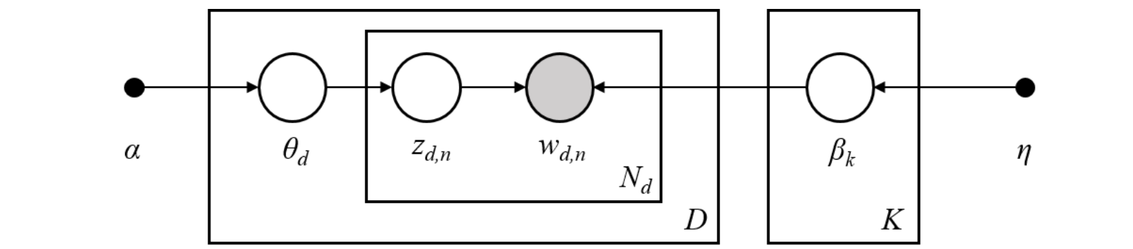 潜在狄利克雷分配(LDA) 潜在狄利克雷分配 (LDA)是一种广泛使用的主题模型,旨在从文档集合中发现潜在主题。潜在狄利克雷分配 (LDA)通过假设每个文档是由多个主题生成的,而每个主题又是由多个词构成的,从而实现对文本数据的建模和分析。潜在狄利克雷分配 (LDA)广泛应用于多个领域,包括文本挖掘、推荐系统、社交网络分析等领域。潜在狄利克雷分配 (LDA)的核心思想是将文档视为主题的混合,每个主题由一组词以不同的概率分布生成。其基本模型可以用以下步骤描述:主题分布 ,为每个文档生成一个主题分布,假设遵循狄利克雷分布 。具体来说,对于文档 ,生成一个主题分布 : ,其中 是超参数,控制主题分布的稀疏性 ;生成词 ,对于文档中的每个词:从主题分布 中抽取一个主题 ,则 ;从该主题的词分布中抽取一个词 ,则 ,其中 是第 个主题的词分布,通常假设遵循狄利克雷分布 ;模型参数 ,潜在狄利克雷分配 (LDA)模型包括超参数 和每个主题的词分布参数 。