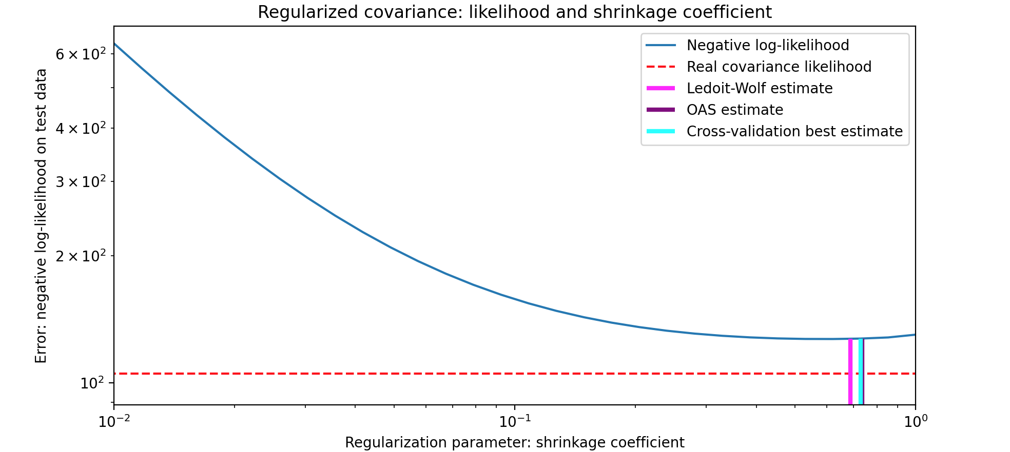 1 2 3 4 5 6 7 8 9 10 11 12 13 14 15 16 17 18 19 20 21 22 23 24 25 26 27 28 29 30 31 32 33 34 35 36 37 38 39 40 41 42 43 44 45 46 47 48 49 50 51 52 53 54 55 56 57 58 59 60 61 62 63 64 65 import numpy as npimport matplotlib.pyplot as pltfrom scipy import linalgfrom sklearn.covariance import OAS, LedoitWolffrom sklearn.model_selection import GridSearchCVfrom sklearn.covariance import ShrunkCovariance, empirical_covariance, log_likelihoodn_features, n_samples = 40 , 20 np.random.seed(42 ) base_X_train = np.random.normal(size=(n_samples, n_features)) base_X_test = np.random.normal(size=(n_samples, n_features)) coloring_matrix = np.random.normal(size=(n_features, n_features)) X_train = np.dot(base_X_train, coloring_matrix) X_test = np.dot(base_X_test, coloring_matrix) shrinkages = np.logspace(-2 , 0 , 30 ) negative_logliks = [-ShrunkCovariance(shrinkage=s).fit(X_train).score(X_test) for s in shrinkages] real_cov = np.dot(coloring_matrix.T, coloring_matrix) emp_cov = empirical_covariance(X_train) loglik_real = -log_likelihood(emp_cov, linalg.inv(real_cov)) tuned_parameters = [{"shrinkage" : shrinkages}] cv = GridSearchCV(ShrunkCovariance(), tuned_parameters) cv.fit(X_train) lw = LedoitWolf() loglik_lw = lw.fit(X_train).score(X_test) oa = OAS() loglik_oa = oa.fit(X_train).score(X_test) fig = plt.figure() plt.title("Regularized covariance: likelihood and shrinkage coefficient" ) plt.xlabel("Regularization parameter: shrinkage coefficient" ) plt.ylabel("Error: negative log-likelihood on test data" ) plt.loglog(shrinkages, negative_logliks, label="Negative log-likelihood" ) plt.plot(plt.xlim(), 2 * [loglik_real], "--r" , label="Real covariance likelihood" ) lik_max = np.amax(negative_logliks) lik_min = np.amin(negative_logliks) ymin = lik_min - 6.0 * np.log((plt.ylim()[1 ] - plt.ylim()[0 ])) ymax = lik_max + 10.0 * np.log(lik_max - lik_min) xmin = shrinkages[0 ] xmax = shrinkages[-1 ] plt.vlines(lw.shrinkage_, ymin, -loglik_lw, color="magenta" , linewidth=3 , label="Ledoit-Wolf estimate" ,) plt.vlines(oa.shrinkage_, ymin, -loglik_oa, color="purple" , linewidth=3 , label="OAS estimate" ) plt.vlines(cv.best_estimator_.shrinkage, ymin, -cv.best_estimator_.score(X_test), color="cyan" , linewidth=3 , label="Cross-validation best estimate" ,) plt.ylim(ymin, ymax) plt.xlim(xmin, xmax) plt.legend() plt.show()