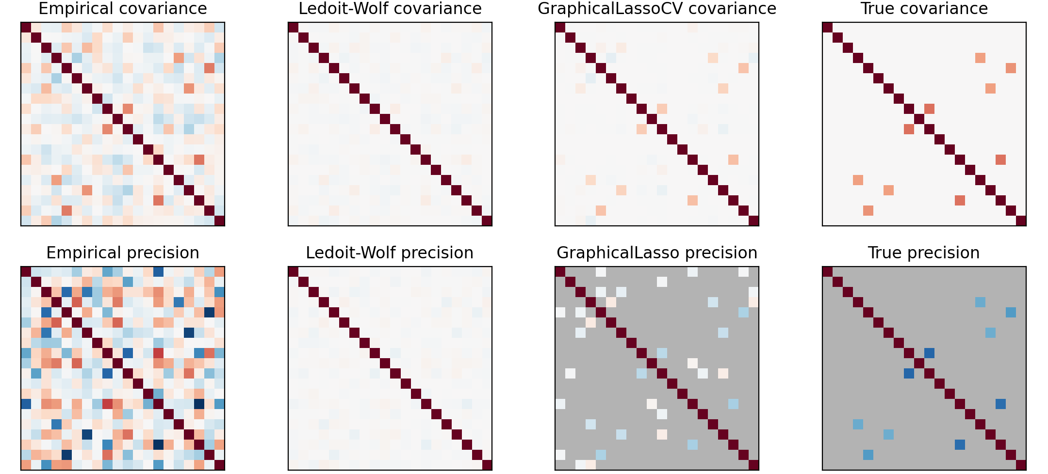 1 2 3 4 5 6 7 8 9 10 11 12 13 14 15 16 17 18 19 20 21 22 23 24 25 26 27 28 29 30 31 32 33 34 35 36 37 38 39 40 41 42 43 44 45 46 47 48 49 50 51 52 53 54 55 56 57 58 import numpy as npimport matplotlib.pyplot as pltfrom scipy import linalgfrom sklearn.datasets import make_sparse_spd_matrixfrom sklearn.covariance import GraphicalLassoCV, ledoit_wolfn_samples = 60 n_features = 20 prng = np.random.RandomState(1 ) prec = make_sparse_spd_matrix(n_features, alpha=0.98 , smallest_coef=0.4 , largest_coef=0.7 , random_state=prng) cov = linalg.inv(prec) d = np.sqrt(np.diag(cov)) cov /= d cov /= d[:, np.newaxis] prec *= d prec *= d[:, np.newaxis] X = prng.multivariate_normal(np.zeros(n_features), cov, size=n_samples) X -= X.mean(axis=0 ) X /= X.std(axis=0 ) emp_cov = np.dot(X.T, X) / n_samples model = GraphicalLassoCV() model.fit(X) cov_ = model.covariance_ prec_ = model.precision_ lw_cov_, _ = ledoit_wolf(X) lw_prec_ = linalg.inv(lw_cov_) plt.figure(figsize=(10 , 6 )) plt.subplots_adjust(left=0.02 , right=0.98 ) covs = [("Empirical" , emp_cov),("Ledoit-Wolf" , lw_cov_),("GraphicalLassoCV" , cov_),("True" , cov),] vmax = cov_.max () for i, (name, this_cov) in enumerate (covs): plt.subplot(2 , 4 , i + 1 ) plt.xticks(()) plt.yticks(()) plt.title("%s covariance" % name) plt.imshow(this_cov, interpolation="nearest" , vmin=-vmax, vmax=vmax, cmap=plt.cm.RdBu_r) precs = [("Empirical" , linalg.inv(emp_cov)),("Ledoit-Wolf" , lw_prec_),("GraphicalLasso" , prec_),("True" , prec),] vmax = 0.9 * prec_.max () for i, (name, this_prec) in enumerate (precs): ax = plt.subplot(2 , 4 , i + 5 ) plt.xticks(()) plt.yticks(()) plt.imshow(np.ma.masked_equal(this_prec, 0 ),interpolation="nearest" ,vmin=-vmax,vmax=vmax,cmap=plt.cm.RdBu_r,) plt.title("%s precision" % name) if hasattr (ax, "set_facecolor" ): ax.set_facecolor(".7" ) else : ax.set_axis_bgcolor(".7" ) plt.show()