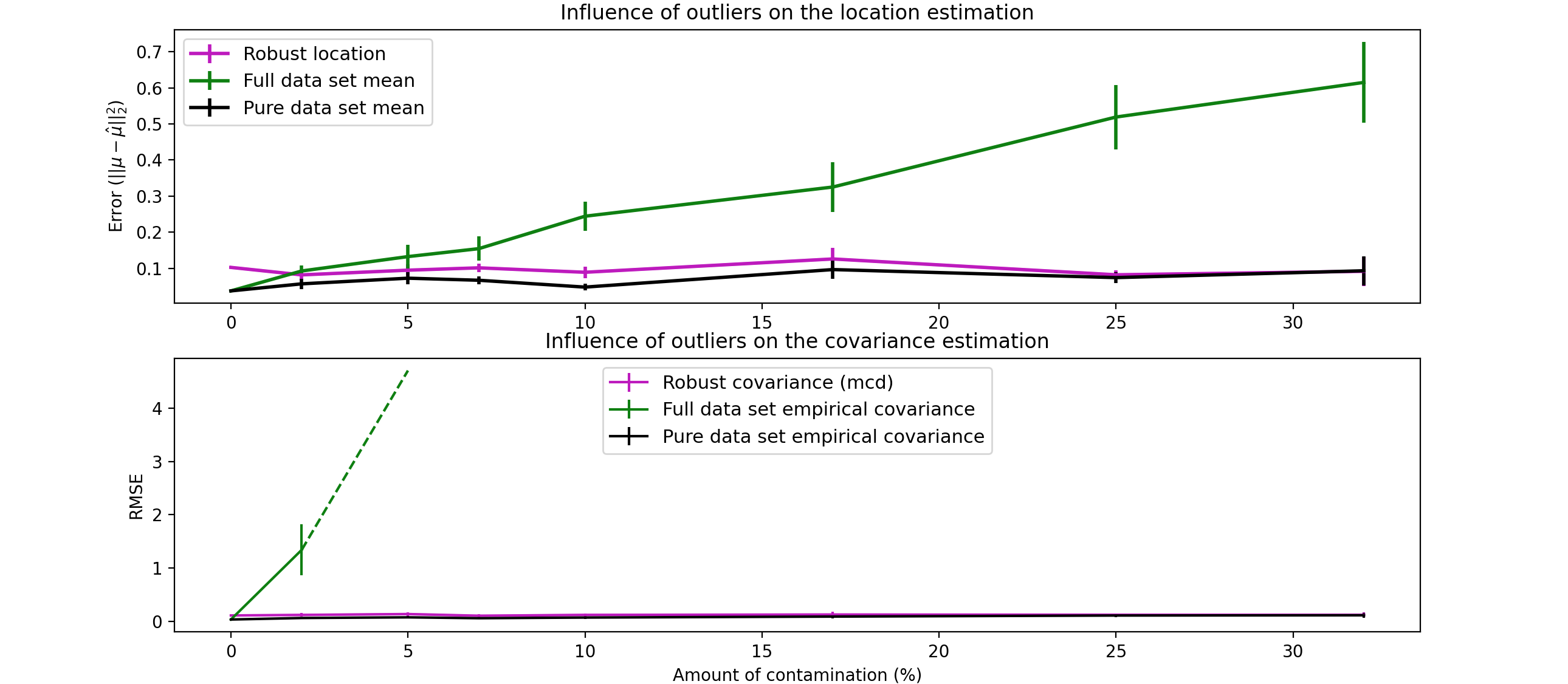 1 2 3 4 5 6 7 8 9 10 11 12 13 14 15 16 17 18 19 20 21 22 23 24 25 26 27 28 29 30 31 32 33 34 35 36 37 38 39 40 41 42 43 44 45 46 47 48 49 50 51 52 53 54 55 56 57 58 59 60 61 62 63 64 65 66 67 68 69 70 71 72 73 74 75 76 77 78 79 import matplotlib.font_managerimport matplotlib.pyplot as pltimport numpy as npfrom sklearn.covariance import EmpiricalCovariance, MinCovDetn_samples = 80 n_features = 5 repeat = 10 range_n_outliers = np.concatenate((np.linspace(0 , n_samples / 8 , 5 ),np.linspace(n_samples / 8 , n_samples / 2 , 5 )[1 :-1 ],)).astype(int ) err_loc_mcd = np.zeros((range_n_outliers.size, repeat)) err_cov_mcd = np.zeros((range_n_outliers.size, repeat)) err_loc_emp_full = np.zeros((range_n_outliers.size, repeat)) err_cov_emp_full = np.zeros((range_n_outliers.size, repeat)) err_loc_emp_pure = np.zeros((range_n_outliers.size, repeat)) err_cov_emp_pure = np.zeros((range_n_outliers.size, repeat)) for i, n_outliers in enumerate (range_n_outliers): for j in range (repeat): rng = np.random.RandomState(i * j) X = rng.randn(n_samples, n_features) outliers_index = rng.permutation(n_samples)[:n_outliers] outliers_offset = 10.0 * (np.random.randint(2 , size=(n_outliers, n_features)) - 0.5 ) X[outliers_index] += outliers_offset inliers_mask = np.ones(n_samples).astype(bool ) inliers_mask[outliers_index] = False mcd = MinCovDet().fit(X) err_loc_mcd[i, j] = np.sum (mcd.location_**2 ) err_cov_mcd[i, j] = mcd.error_norm(np.eye(n_features)) err_loc_emp_full[i, j] = np.sum (X.mean(0 ) ** 2 ) err_cov_emp_full[i, j] = (EmpiricalCovariance().fit(X).error_norm(np.eye(n_features))) pure_X = X[inliers_mask] pure_location = pure_X.mean(0 ) pure_emp_cov = EmpiricalCovariance().fit(pure_X) err_loc_emp_pure[i, j] = np.sum (pure_location**2 ) err_cov_emp_pure[i, j] = pure_emp_cov.error_norm(np.eye(n_features)) lw = 2 plt.subplot(2 , 1 , 1 ) font_prop = matplotlib.font_manager.FontProperties(size=11 ) plt.errorbar(range_n_outliers,err_loc_mcd.mean(1 ),yerr=err_loc_mcd.std(1 ) / np.sqrt(repeat),label="Robust location" ,lw=lw,color="m" ,) plt.errorbar(range_n_outliers,err_loc_emp_full.mean(1 ),yerr=err_loc_emp_full.std(1 ) / np.sqrt(repeat),label="Full data set mean" ,lw=lw,color="green" ,) plt.errorbar(range_n_outliers,err_loc_emp_pure.mean(1 ),yerr=err_loc_emp_pure.std(1 ) / np.sqrt(repeat),label="Pure data set mean" ,lw=lw,color="black" ,) plt.title("Influence of outliers on the location estimation" ) plt.ylabel(r"Error ($||\mu - \hat{\mu}||_2^2$)" ) plt.legend(loc="upper left" , prop=font_prop) plt.subplot(2 , 1 , 2 ) x_size = range_n_outliers.size plt.errorbar(range_n_outliers,err_cov_mcd.mean(1 ),yerr=err_cov_mcd.std(1 ),label="Robust covariance (mcd)" ,color="m" ,) plt.errorbar(range_n_outliers[: (x_size // 5 + 1 )],err_cov_emp_full.mean(1 )[: (x_size // 5 + 1 )],yerr=err_cov_emp_full.std(1 )[: (x_size // 5 + 1 )], label="Full data set empirical covariance" ,color="green" ) plt.plot(range_n_outliers[(x_size // 5 ) : (x_size // 2 - 1 )],err_cov_emp_full.mean(1 )[(x_size // 5 ) : (x_size // 2 - 1 )],color="green" ,ls="--" ,) plt.errorbar(range_n_outliers,err_cov_emp_pure.mean(1 ),yerr=err_cov_emp_pure.std(1 ),label="Pure data set empirical covariance" ,color="black" ,) plt.title("Influence of outliers on the covariance estimation" ) plt.xlabel("Amount of contamination (%)" ) plt.ylabel("RMSE" ) plt.legend(loc="upper center" , prop=font_prop) plt.show()