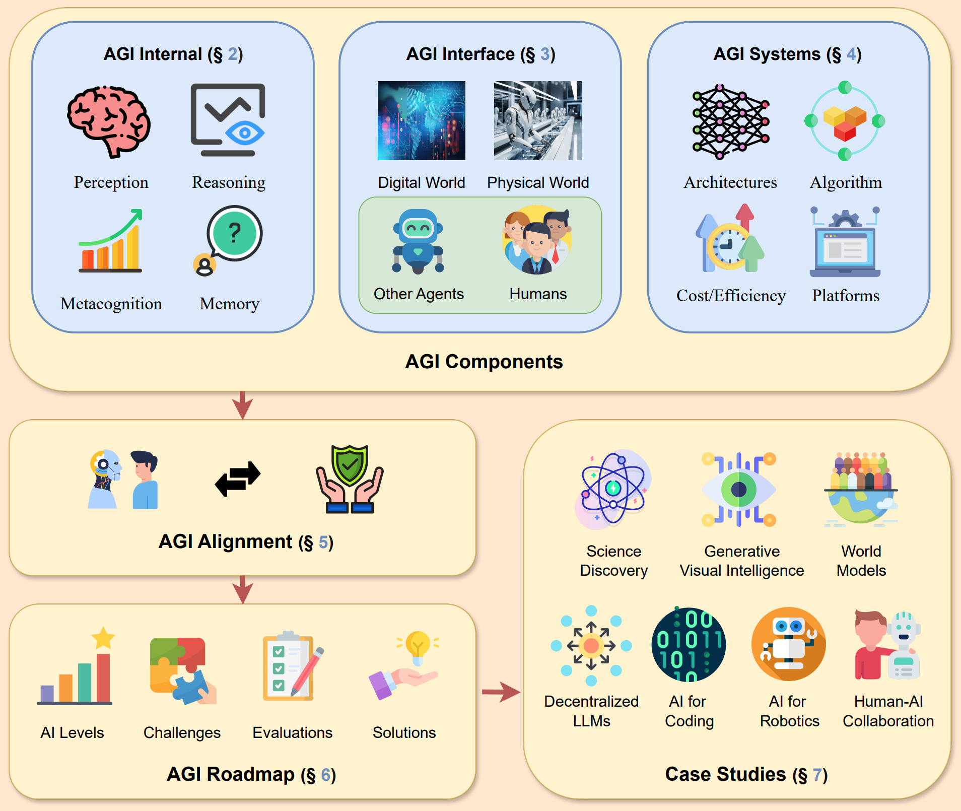 由上图所示,从AGI(人工通用智能)所需的主要能力概述开始,分为内部能力、与外部世界的接口连接以及支持这些功能的基础设施系统。在部署方面,需要更为复杂的对齐程序,以在约束和人类期望下释放AGI系统的潜力。此外,我们描绘了一个路线图。AGI的三个层次:胚胎AGI、超人类AGI和终极AGI,帮助我们定位当前状态、相关评估框架以及对一些可能阻碍我们向AGI前进的关键问题的见解。